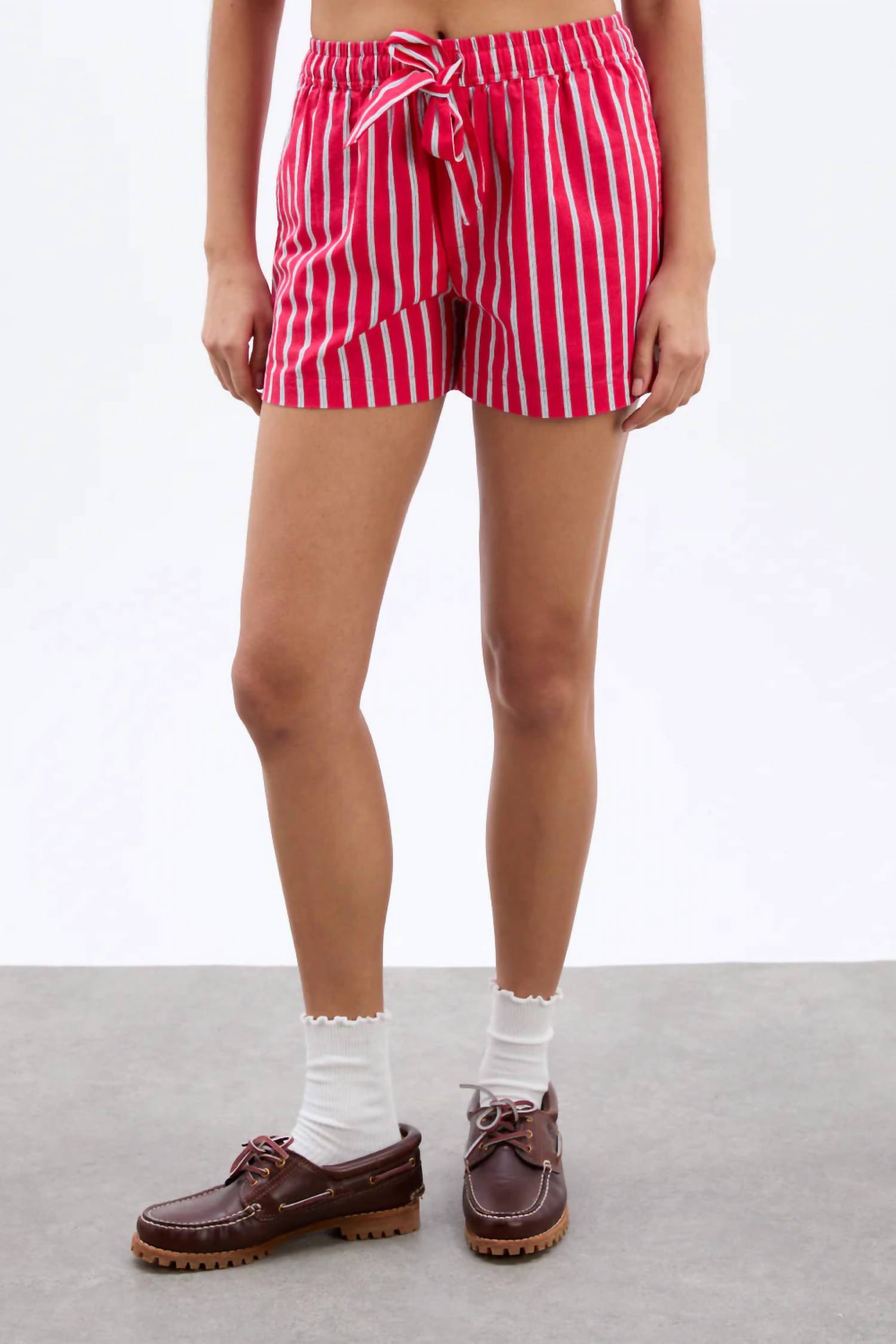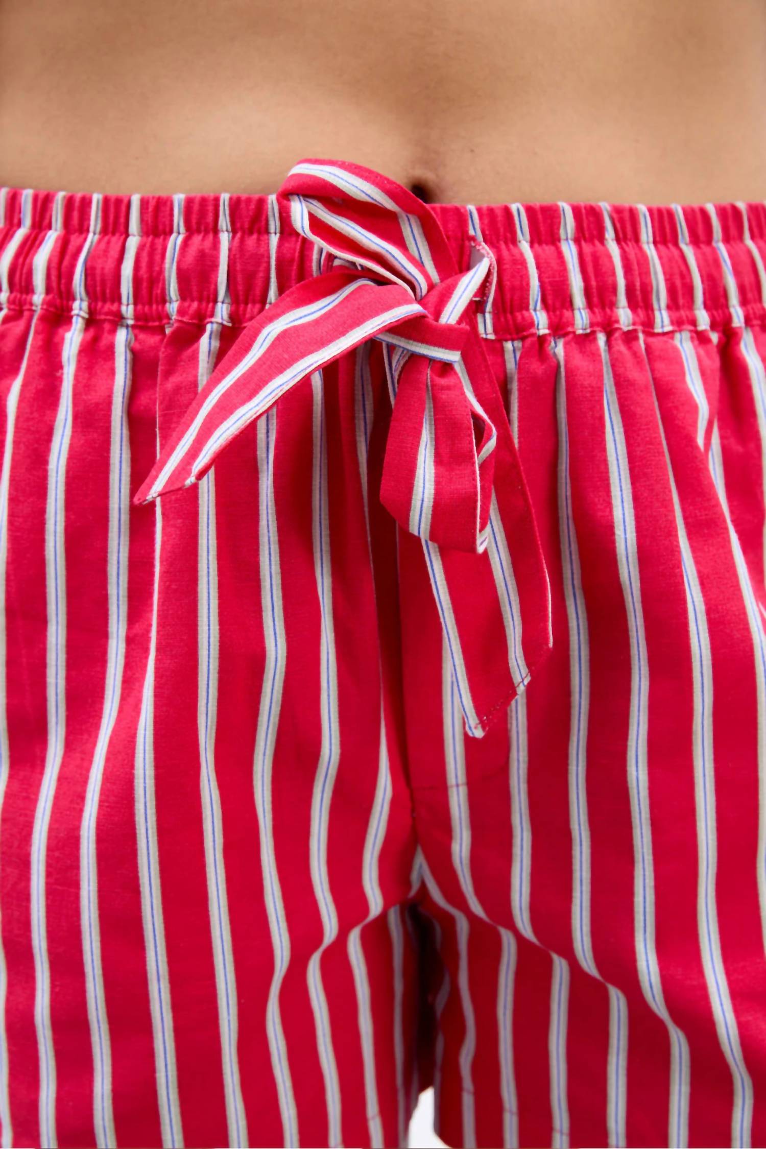 High-waist is here to stay and we especially love this style short. Stay cool and stylish this summer with the Women's Krissy Boxer Shorts by Damson Madder in a striking red stripe. These shorts, made in India, boast a breathable blend of 88% organic cotton and 12% linen, offering a comfortable mid-rise fit with a convenient pull-on closure. They feature practical side and back pockets, along with an adjustable tie waist for a custom fit. Machine wash them for easy care and pair them with the matching shell blouse for a coordinated look.