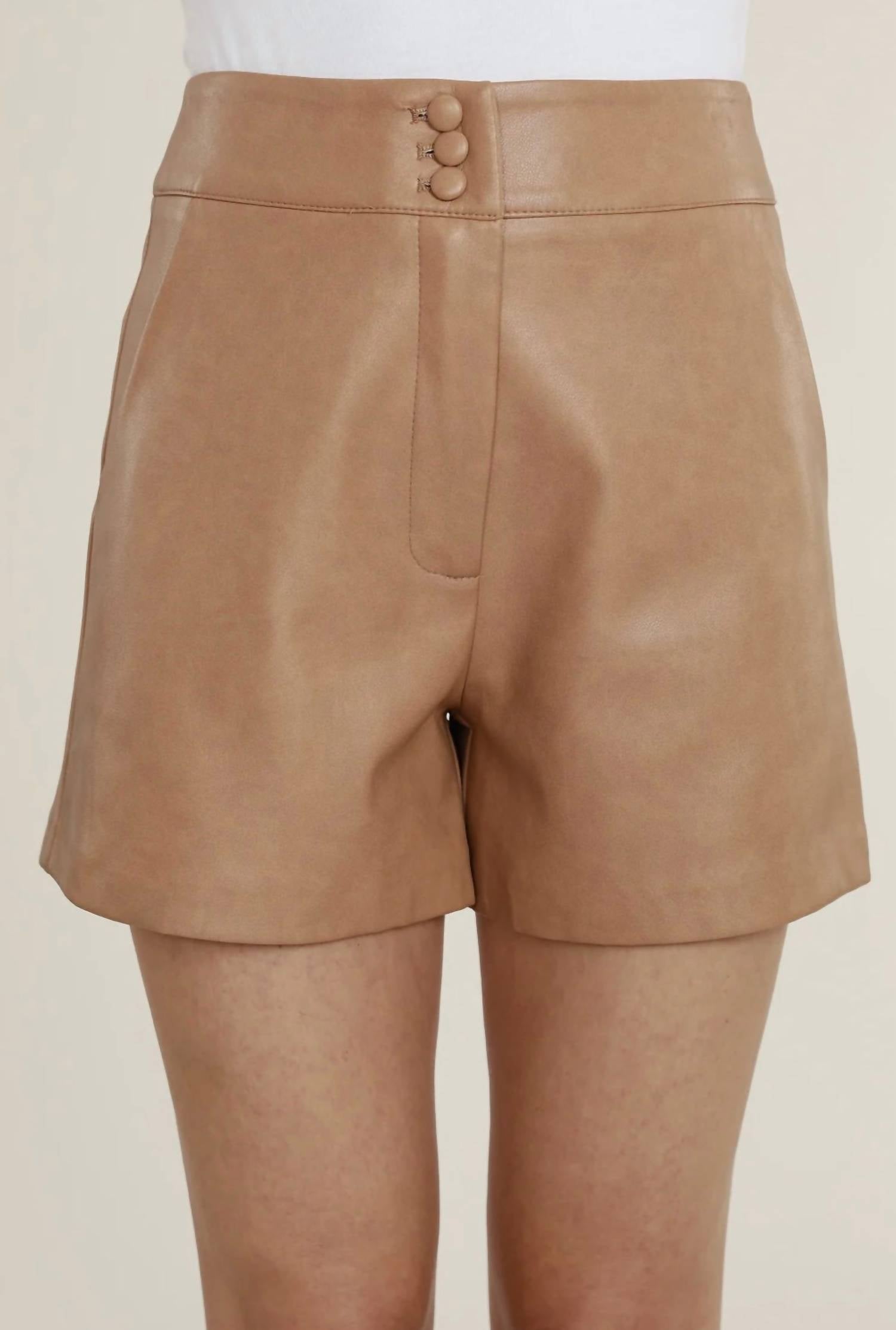 Fit to perfection, we love these high-waist shorts and you will too. Elevate your seasonal style with the Vegan Leather Shorts by Dolce Cabo, featuring a chic high-waisted silhouette that highlights your figure. These women's shorts are crafted from bold faux leather, combining contemporary design with comfort. Available in a rich copper hue and complete with practical pockets, they're a perfect minimalist essential for pairing with knits or blouses. Closure is a button type, and the shorts require dry cleaning to maintain their sleek appearance.