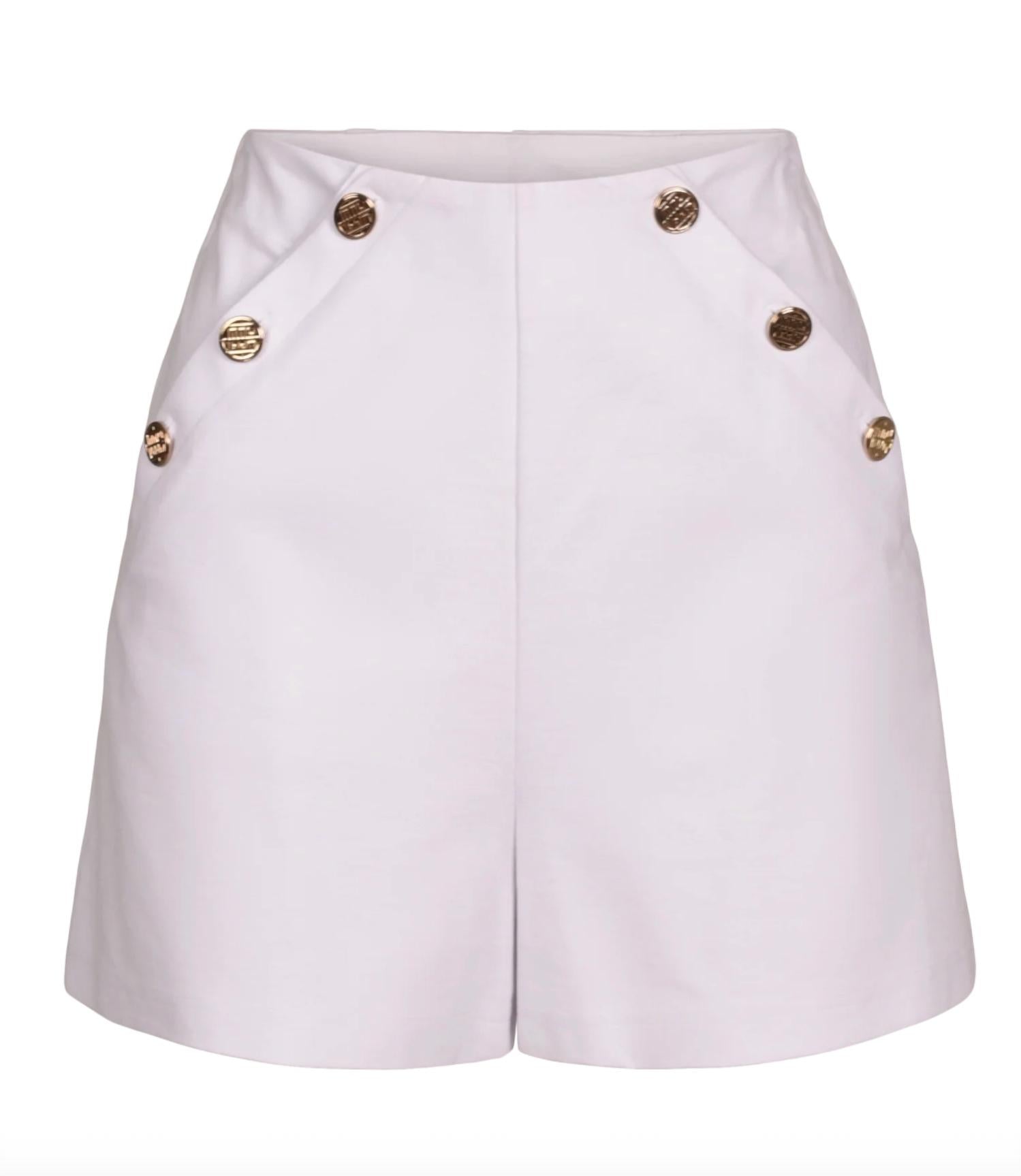 High-waist is here to stay and we especially love this style short. Introducing the Saylor Knit Short by Emily McCarthy, crafted in luxurious ponte knit fabric for ultimate comfort and style in a sophisticated White Ponte hue. Designed with a high waist and solid pattern, these shorts feature chic button detailing that complements its classic silhouette. Closure is a button closure, adding function to flair. For care, hand wash and lay flat to dry. Randi, standing at 5'1", gracefully models a size X-Small, embodying a seamless blend of summer elegance and quiet luxury.