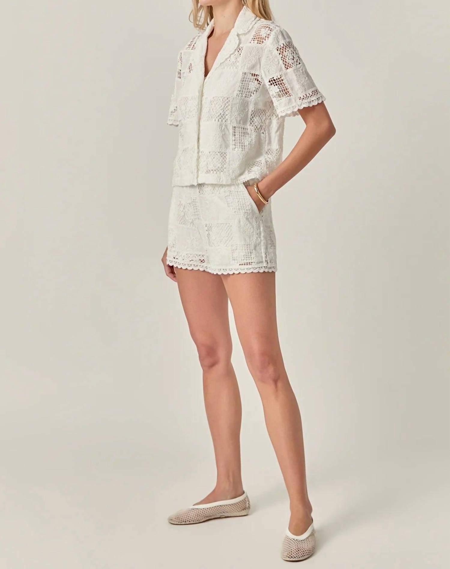 Fit to perfection, we love these high-waist shorts and you will too. Introducing the Ibiza Embroidered Shorts by English Factory, a chic addition to any summer wardrobe. These high-waisted, mini-length shorts in white 100% cotton feature intricate all-over embroidery and crochet details, complete with scalloped edges for added texture and charm. Practical elements like an elastic waistband, handy side pockets, and a soft lining ensure comfort and style. Care: Machine wash and line dry.