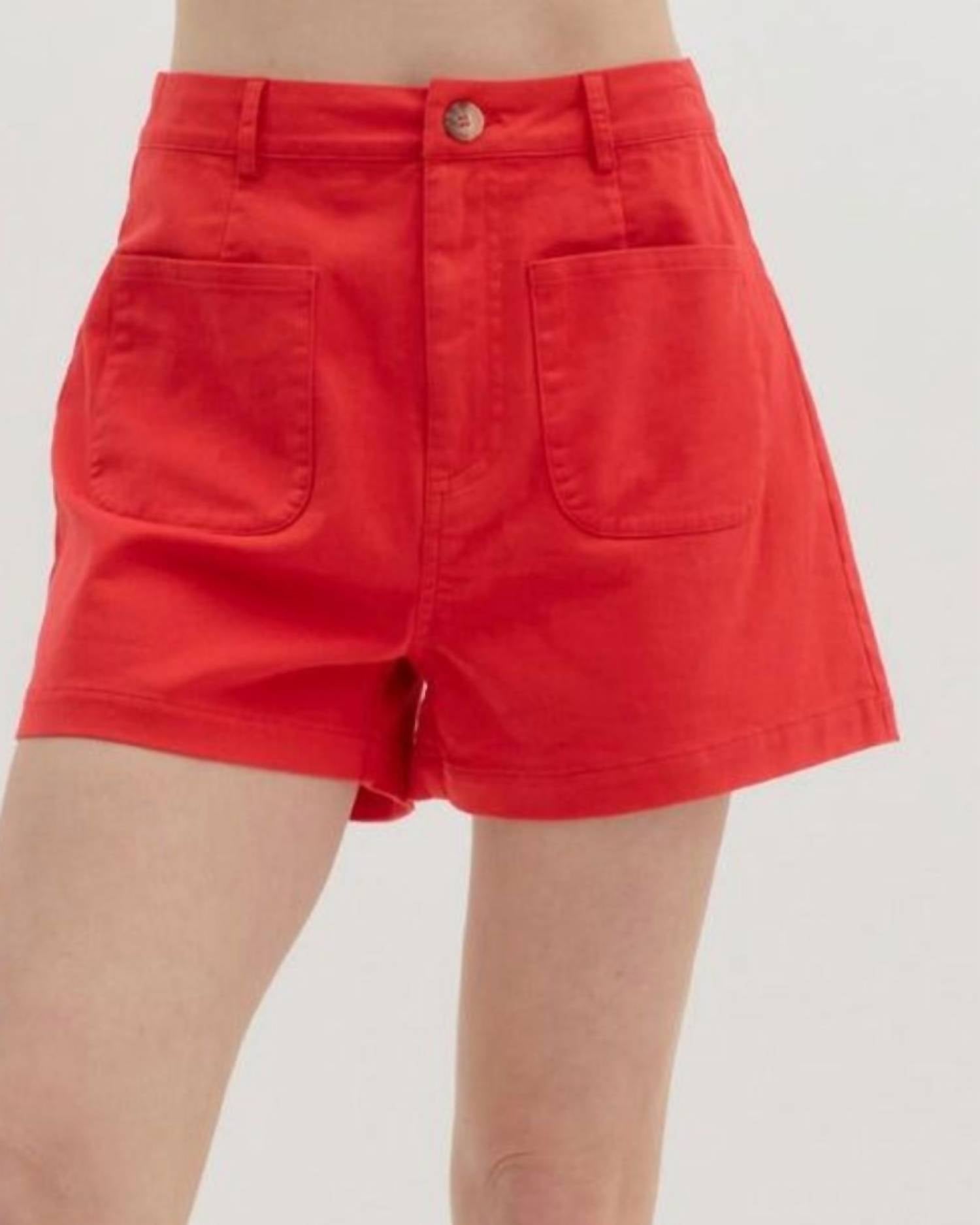 Fit to perfection, we love these high-waist shorts and you will too. Brighten up your summer wardrobe with the Entro High Waist Shorts, designed in a striking red hue. Crafted from a comfortable cotton blend (97% cotton, 3% spandex), they feature a classic button and zipper closure for a clean silhouette. Front patch pockets provide practical charm, while faux welt pockets at the back add a polished touch. Care instructions recommend hand washing cold and line drying for longevity.