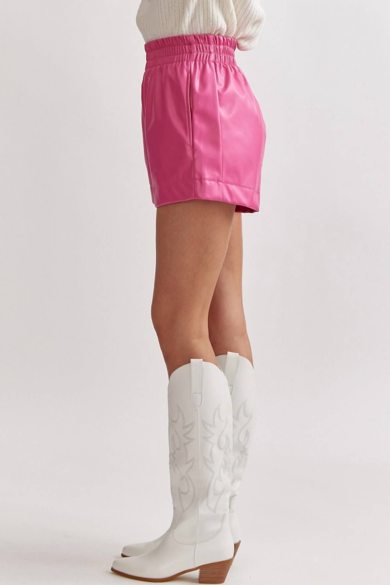 High-waist is here to stay and we especially love this style short. Introducing the High Waisted Shorts by entro, a chic piece in vibrant hot pink designed for a statement summer look. These faux leather shorts feature an elastic waistband with side pockets for added convenience. Composition: 55% PU, 45% Polyester. Closure: Pull on. Measurements: Waist - Small 26", Medium 28", Large 30"; Inseam - 3". Perfect for vacation wear, this lightweight piece is unlined and non-sheer for carefree days.