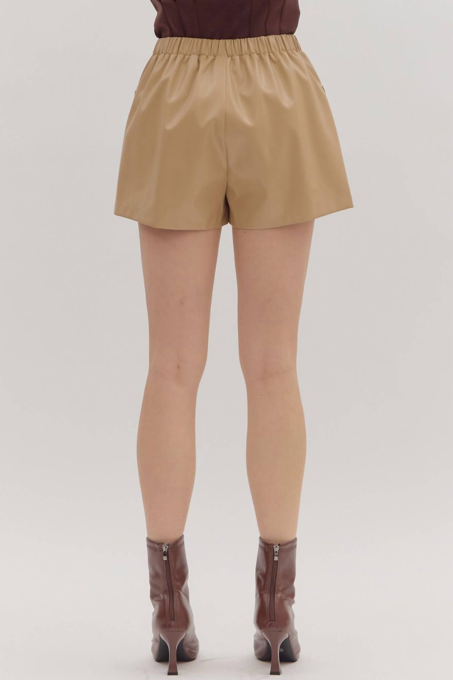 Fit to perfection, we love these high-waist shorts and you will too. Introducing the Laced Up Grommet Detailed Pleather Shorts by Entro, a chic addition to your spring wardrobe in a stylish tan. Crafted from high-quality faux leather in a solid minimalist design, these high-waist shorts feature unique grommet lace-up detail on the front patch pockets and an elasticated waistband at the back for ease of wear. Closure: Pull-on. Perfect for vacation occasions, these shorts are unlined, woven, non-sheer, and lightweight, offering both fashion and functionality.