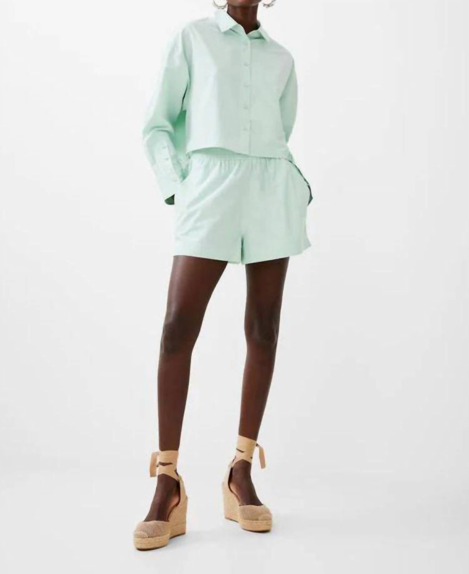 Fit to perfection, we love these high-waist shorts and you will too. Upgrade your summer wardrobe with the Women's High Waist Woven Pull-on Shirting Shorts by French Connection. Crafted in a subtle green, these solid, streetwear-inspired shorts offer both style and comfort for your on-the-go travel needs. Made from 100% cotton, they come with convenient pockets and a pull-on closure for ease of wear. Care is simple: machine wash and tumble dry, ensuring these shorts are travel-ready.