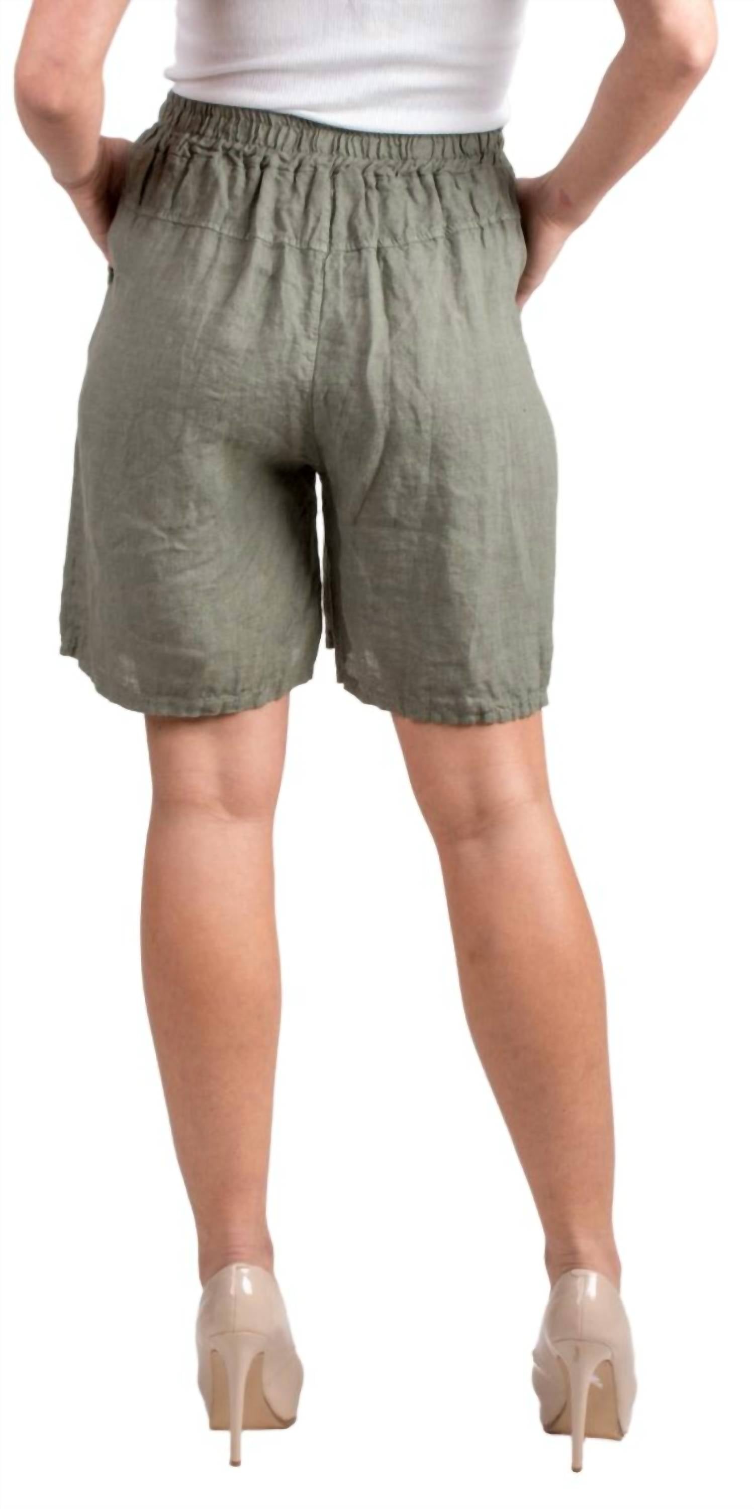 Fit to perfection, we love these high-waist shorts and you will too. Elevate your summer wardrobe with the Silvana Linen Shorts by GIGI MODA, perfect for casual outings and travel escapades. Crafted from 100% linen, these women's high-waist shorts in trendy olive offer a solid pattern with a stretchy elastic waistband and tie waist for a comfortable fit. Made in Italy, they feature practical side pockets and a convenient pull-on closure for easy wear. Care instructions recommend hand washing and line drying to maintain their quality. Designed as a one-size piece, they complement various body types, with a model height of 5'7" showcasing the fit.