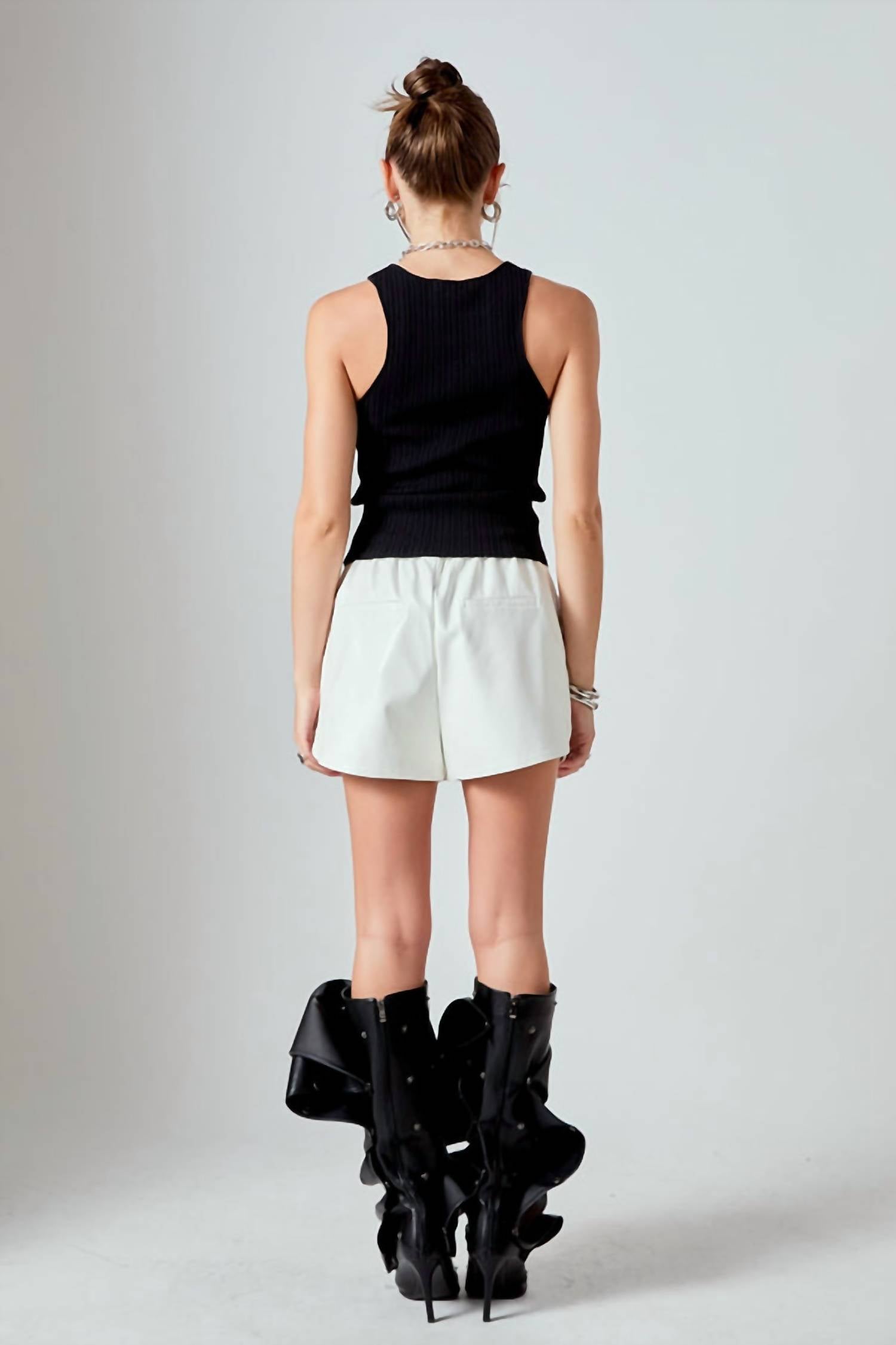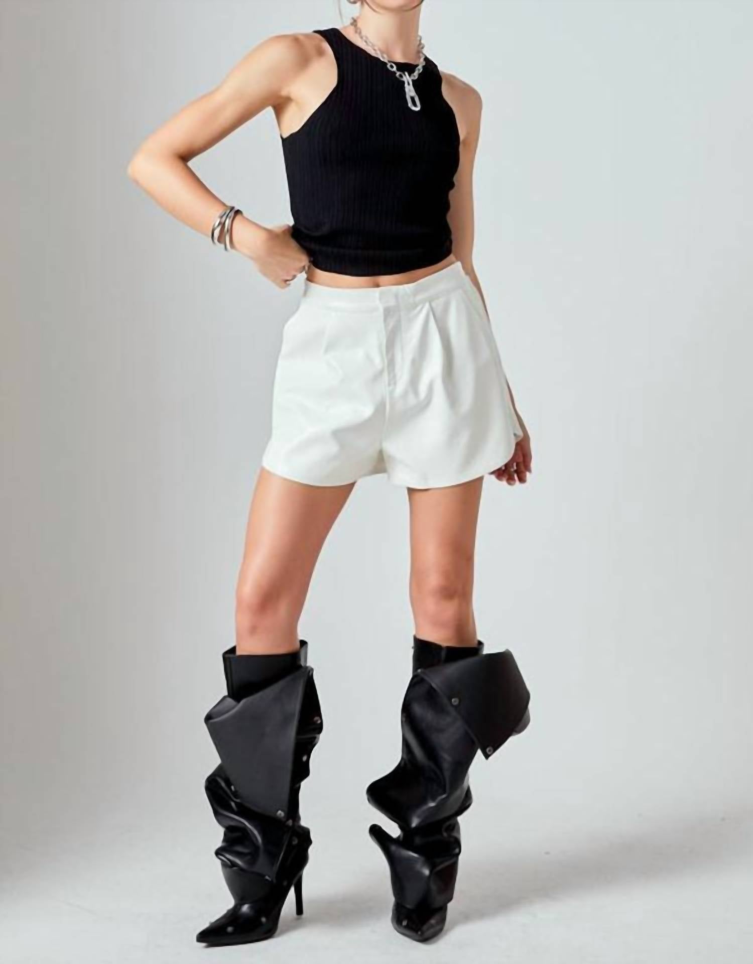 Tuck your favorite tee into these high-waist shorts for a more casual-cool feel. Elevate your wardrobe with Grey Lab's High Waisted Faux Leather Shorts, crafted in sleek white genuine leather. These women's shorts feature a shiny faux leather appearance with high-waisted design, conveniently paired with an elastic waistband at the back for enhanced comfort. The shorts offer practical side pockets and decorative back pockets, accentuated by a front pleated detail and a secure front zipper and metal hook closure. Composition: Shell is 100% Polyester with a 100% Polyurethane coating; Lining is 100% Polyester; Contrast is 95% Polyester and 5% Spandex. Care: Hand wash cold, do not bleach, line dry, do not dry clean, and do not iron.