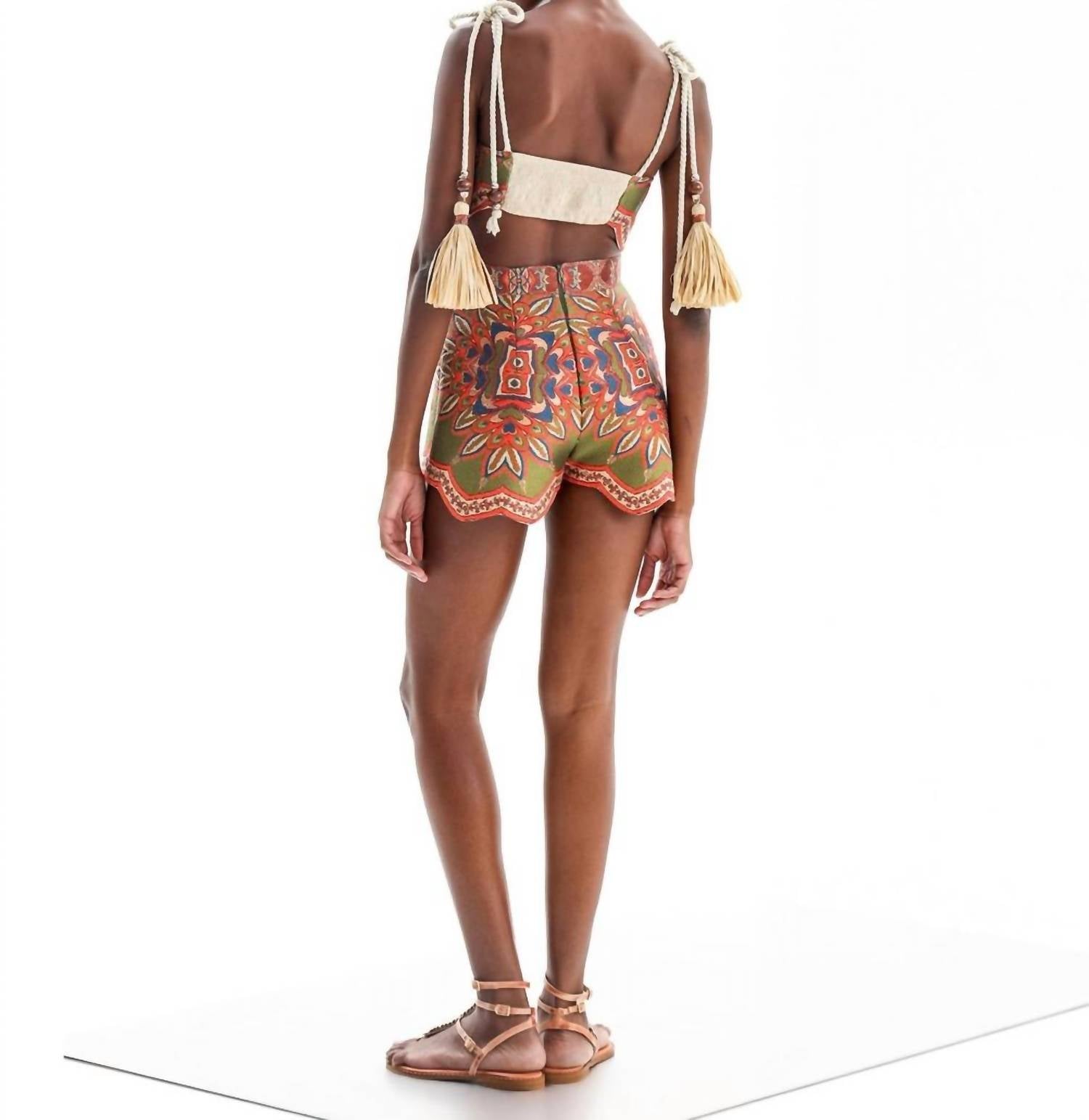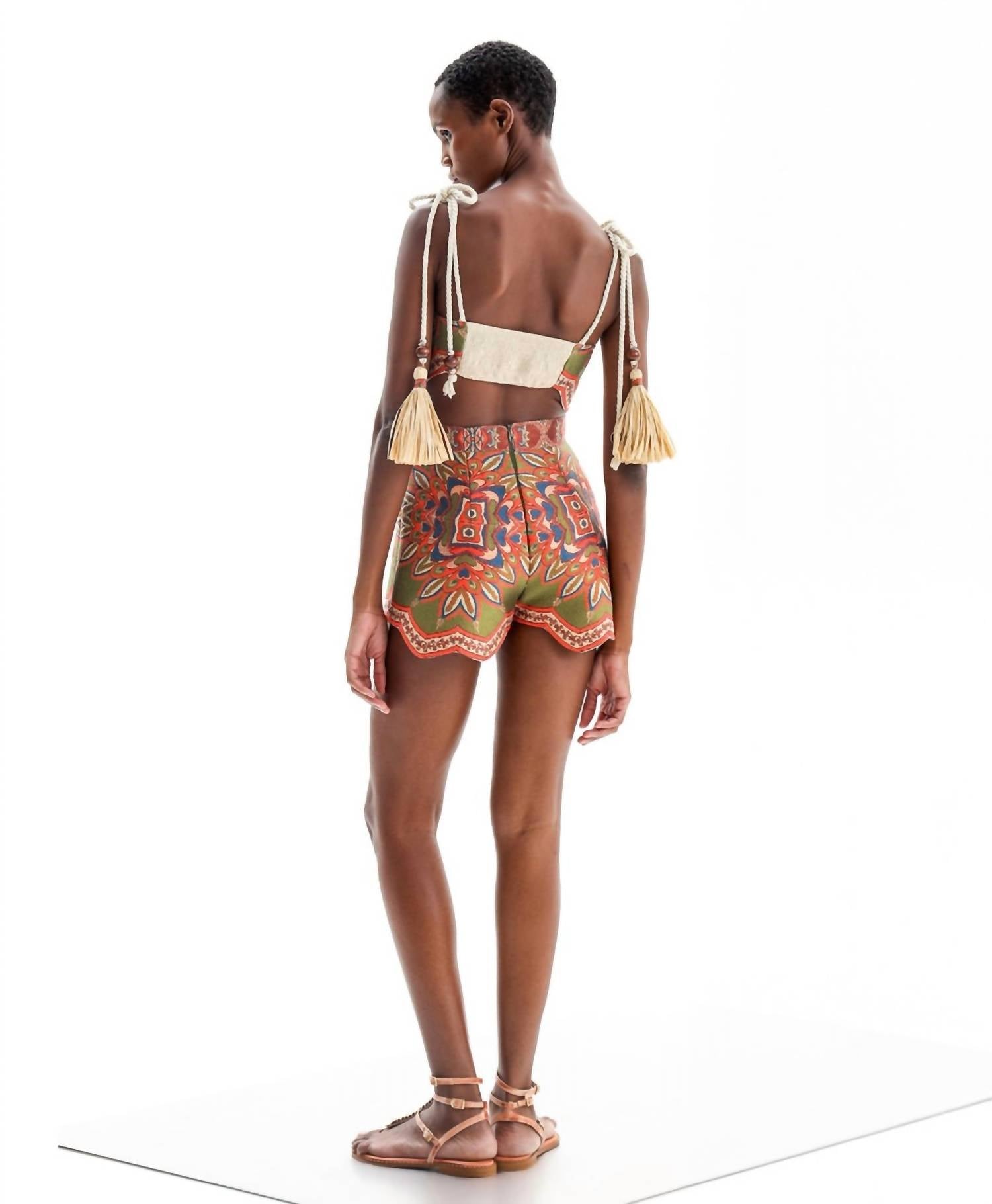 Fit to perfection, we love these high-waist shorts and you will too. Introducing the Agape Shorts by Lace The Label, a high-waisted silhouette perfect for your holiday party ensemble. Crafted from 85% polyester, 13% viscose, and 2% lurex, these patterned shorts in orange, green, ivory, and blue boast scalloped edges and a stunning jacquard motif. Originating with a chic boho style, they feature a convenient zip closure at the back. Keep them looking fresh with a cold machine wash.