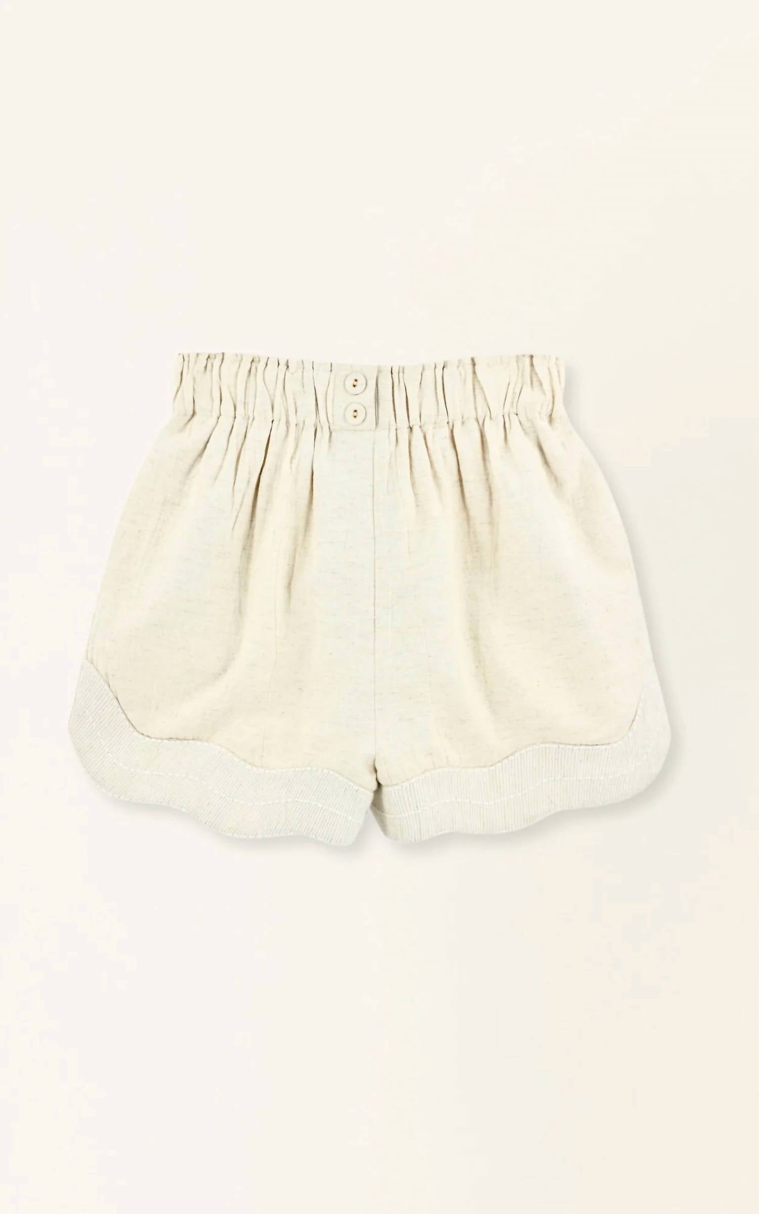 High-waist is here to stay and we especially love this style short. Introducing the Track High Rise Short by Mirth, a minimalist summer essential in a sophisticated Oat Fossil hue. These high-waisted shorts feature a wide elastic waistband with a non-functional button detail and a 3" inseam, offering a comfortable and stylish fit. Crafted from cotton flax and lined with 100% cotton, the shorts are made in India and feature side pockets and linear, wavy embroidery along the hem for added flair. Closure type: Pull On.