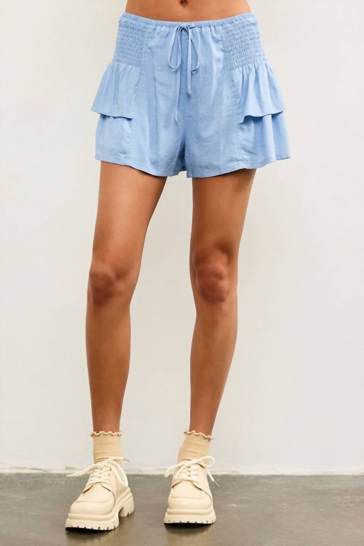 Fit to perfection, we love these high-waist shorts and you will too. Experience relaxed elegance with Mustard Seed's Swept Away Side Tiered Shorts, perfect for a boho-chic summer vibe. These high-waisted shorts in light blue feature a solid pattern with a versatile pull-on closure. Crafted from a blend of 80% viscose and 20% linen, they're designed for breathability and comfort. Care instructions include machine wash for hassle-free maintenance.