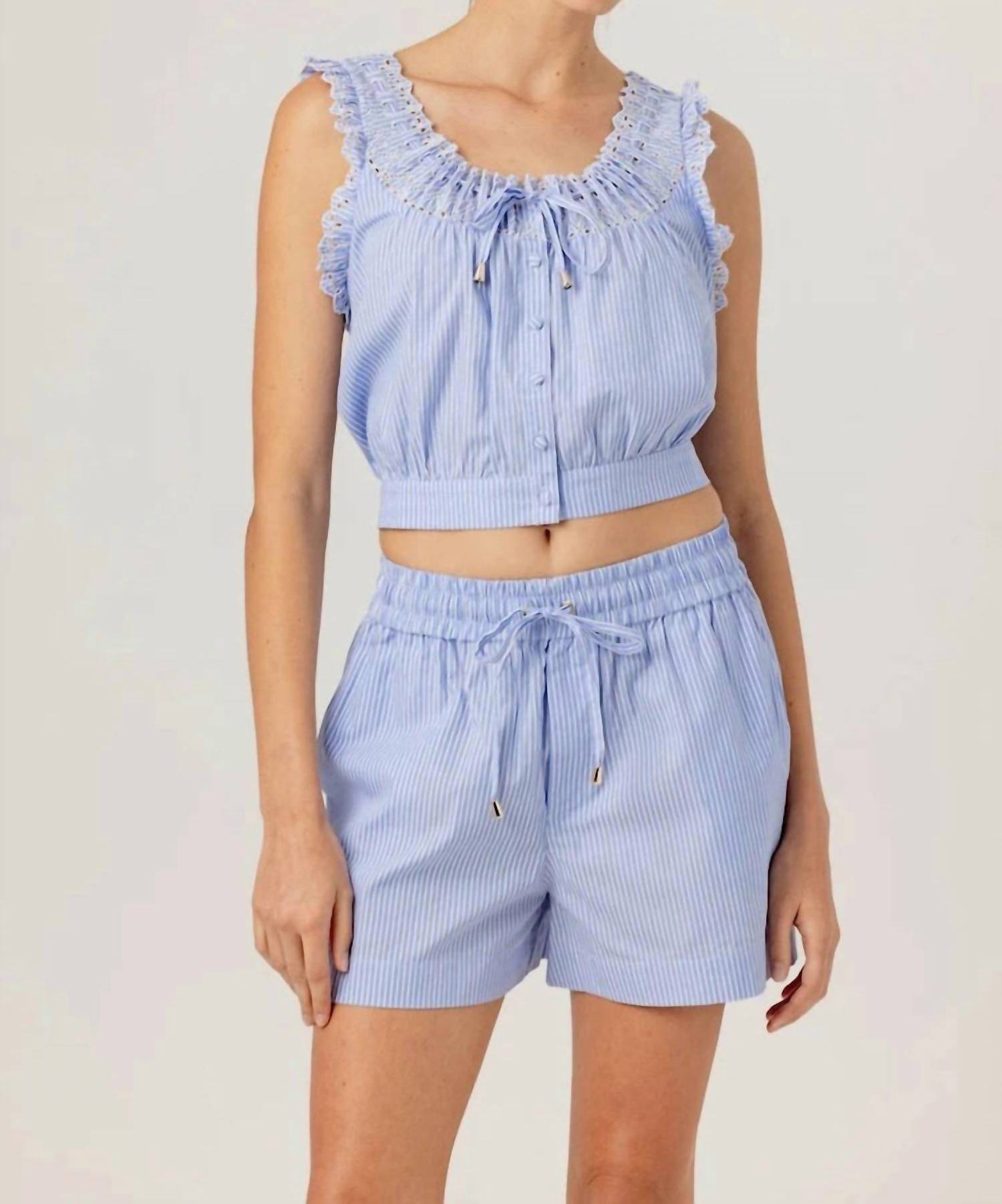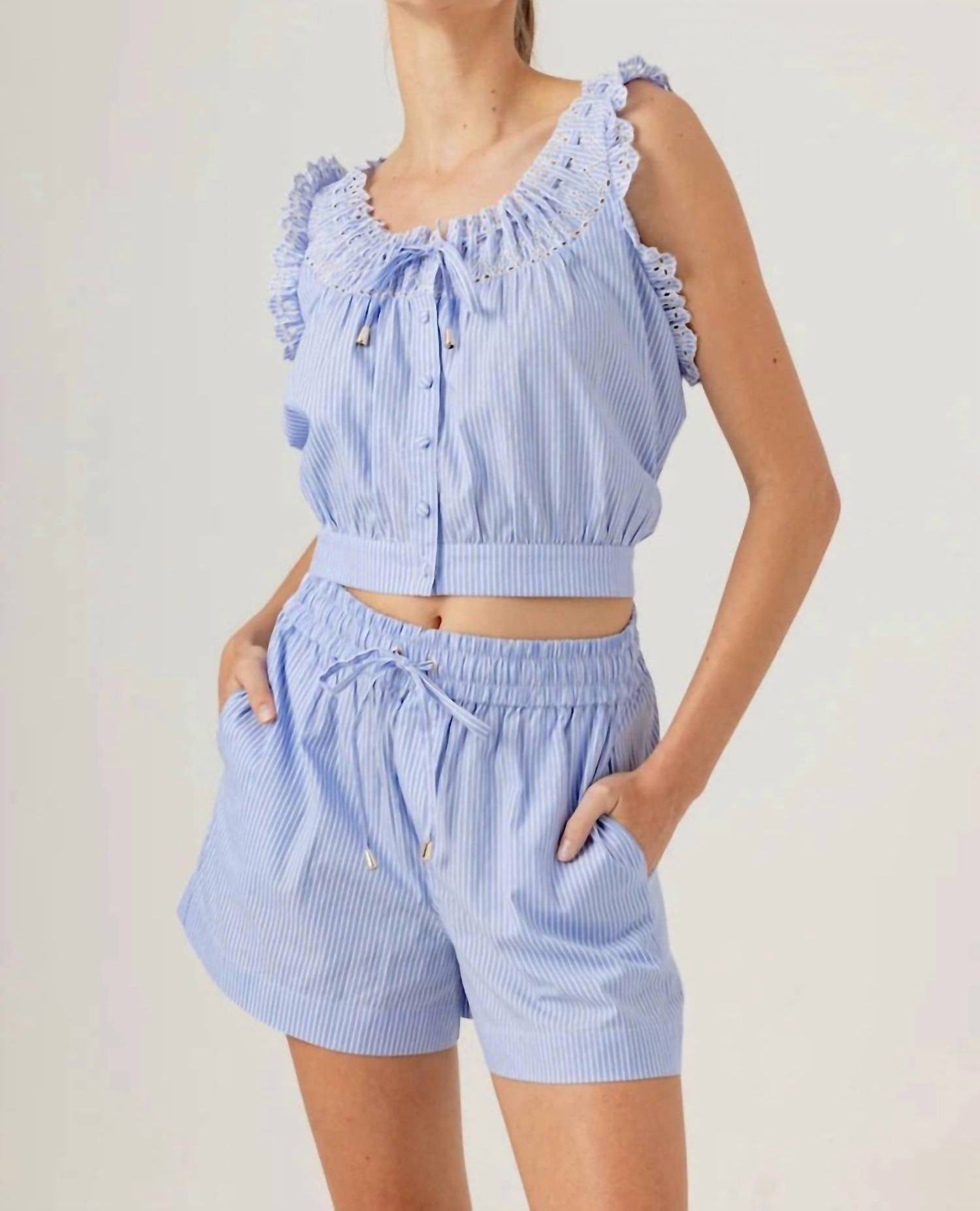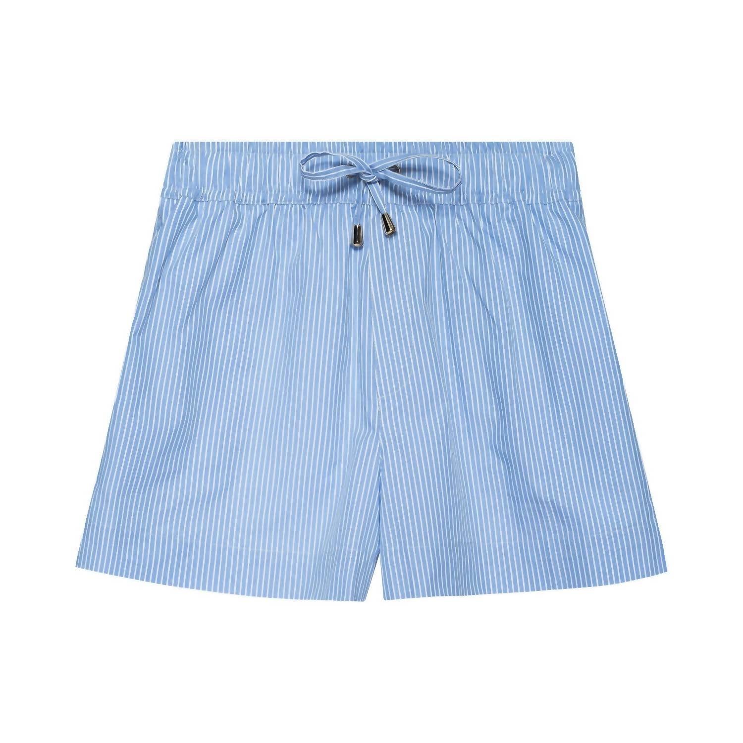 High-waist is here to stay and we especially love this style short. Discover effortless summer style with the Edith Shorts by Sundays, featuring a playful yarn-dyed stripe in blue. These high-waisted shorts offer a comfortable pull-on fit, complete with an elastic waistband and a functional drawcord adorned with gold metal tips for added flair. Made from 100% cotton, they boast a 2.25" inseam and convenient side pockets. Crafted for easy maintenance, simply machine wash cold and tumble dry low; for a polished finish, lightly iron on low heat. Model is wearing a size XS (5’10”, 25” waist, 35” hips, 32” bust).