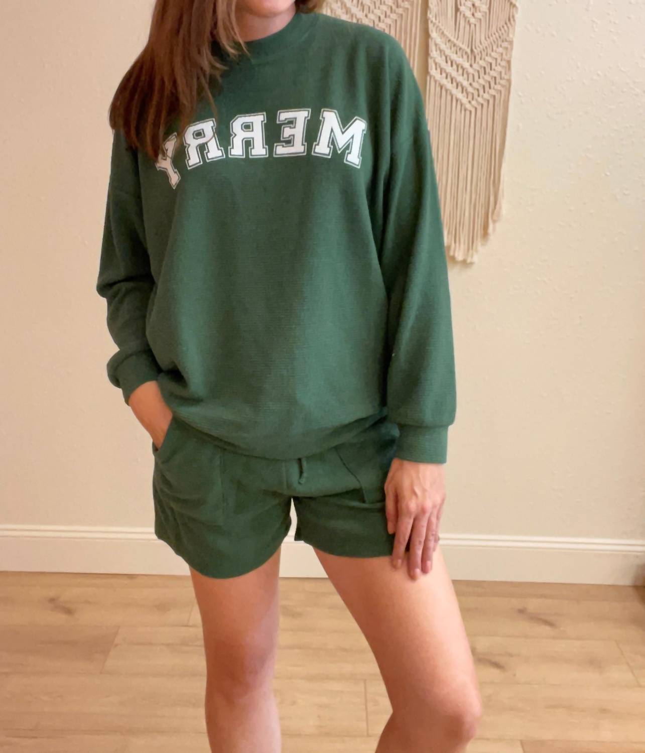 High-waist is here to stay and we especially love this style short. Indulge in comfort with the Cloud Knit Lounge Shorts by Tres Bien, a must-have for your summer lounging. Featuring a high-waist, pull-on design, these red shorts are crafted from a plush blend of 71% Polyester, 27% Cotton, and 2% Spandex and include convenient pockets for practical style. Ideal for vacations or Christmas lounging, they're machine washable for effortless upkeep and can be paired with the Jolly sweatshirt for a coordinated monochrome look.