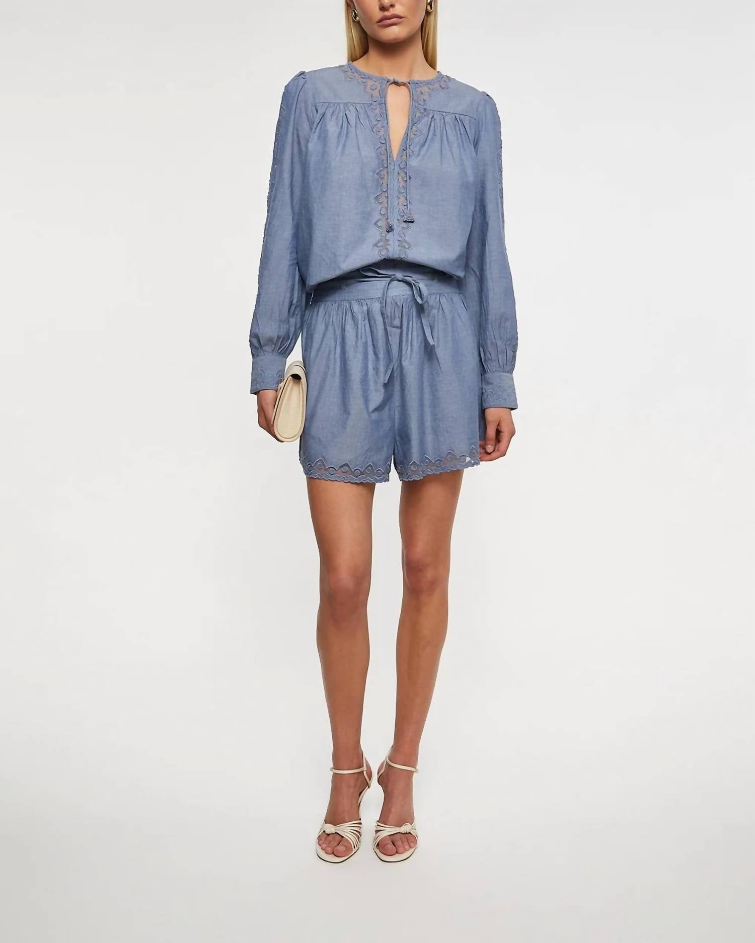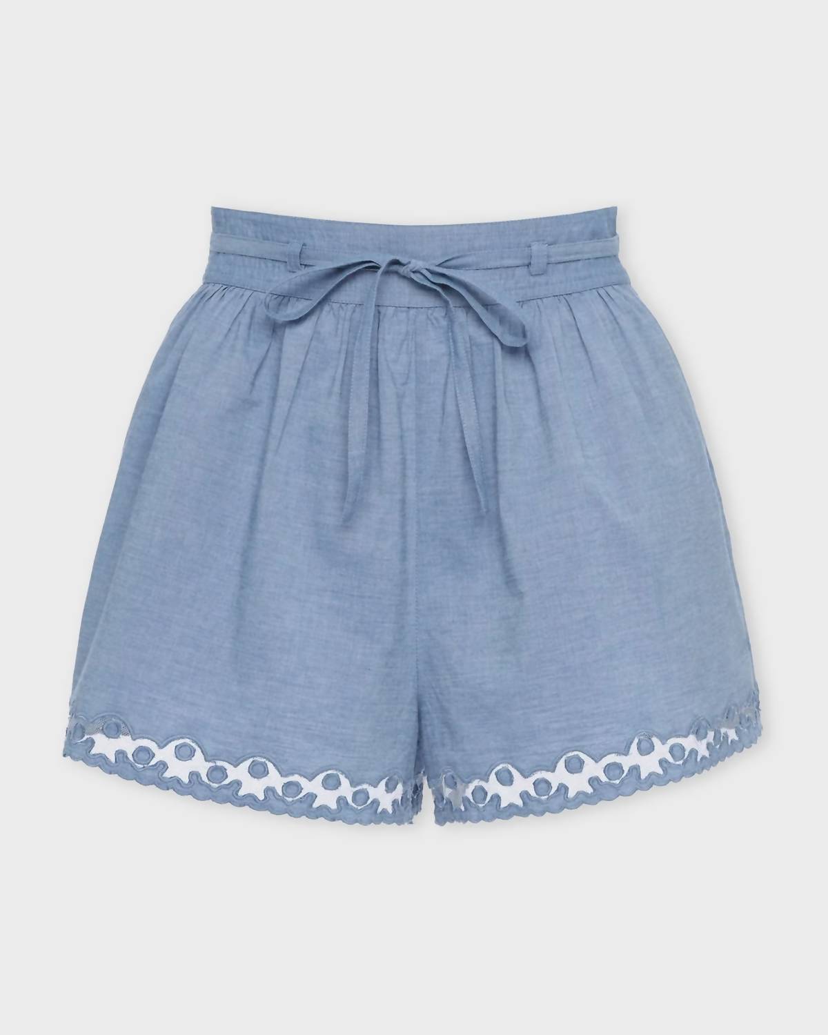Tuck your favorite tee into these high-waist shorts for a more casual-cool feel. Introducing the Elowen Cotton Shorts by Ulla Johnson, the perfect high-waisted addition to your summer wardrobe. Made from 100% cotton in a charming chambray color, these shorts offer a textured minimalist feel with practical pockets. They feature a concealed side zipper and a removable belt for a customizable fit. Easy to care for, they are machine washable and can be tumble dried, making them ideal for vacation wear.