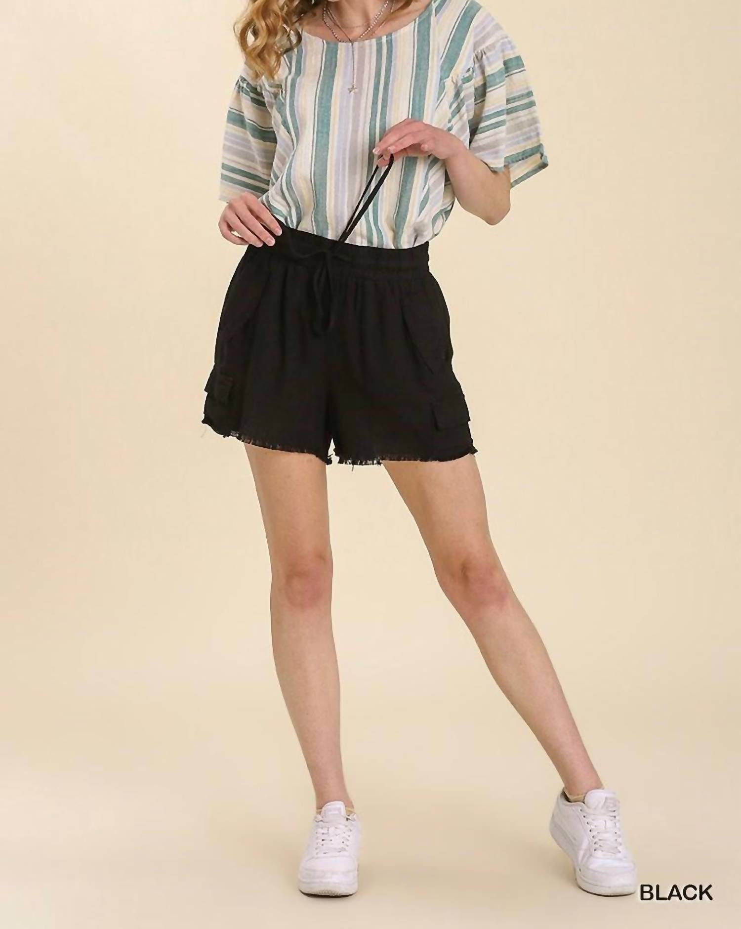 Fit to perfection, we love these high-waist shorts and you will too. Experience effortless style and comfort with Umgee's Front Tie And Pocket Detail Shorts, a chic choice for summer occasions. Crafted from a linen blend, these high-waisted shorts feature a stylish front tie and convenient pockets for storing essentials. The solid black design offers easy pairing, while the pull-on closure ensures a comfortable fit. Care: Machine wash and lay flat to dry. Model is 5'8" and wearing a size small.