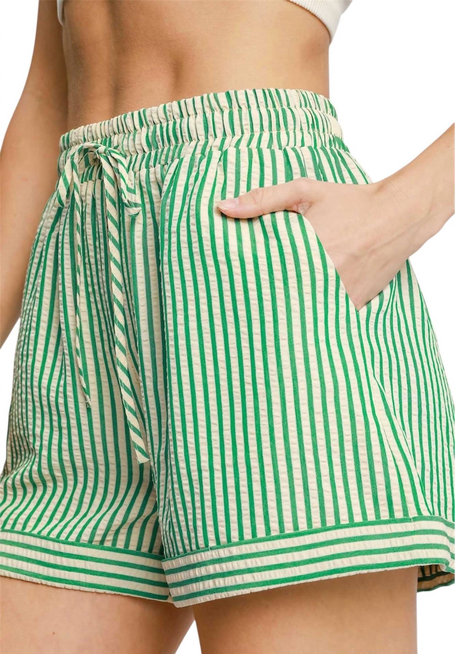 Tuck your favorite tee into these high-waist shorts for a more casual-cool feel. Introducing the Striped Seersucker Shorts by Umgee, a summer essential for women who value style and comfort. These high-waisted shorts feature a refreshing green stripe pattern and a convenient pull-on closure. Crafted from breathable seersucker fabric, they are perfect for a vacation-ready ensemble. Waist measurements are: small 28”, medium 30”, large 32”, with a 3” inseam.