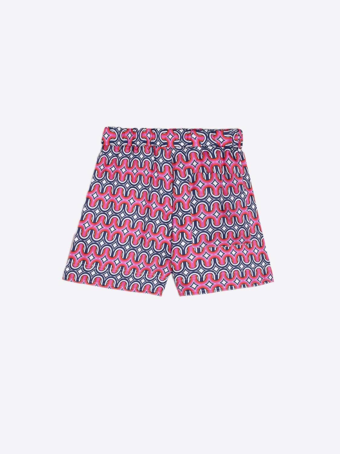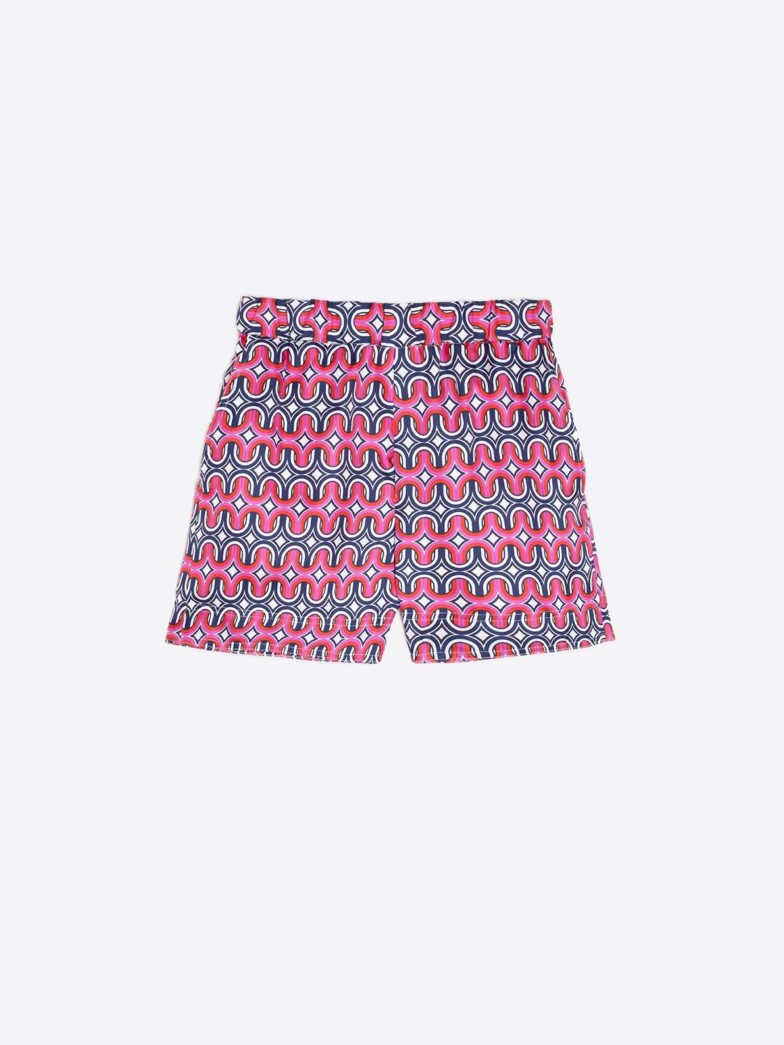 High-waist is here to stay and we especially love this style short. Vilagallo presents the Mariela Geometric Shorts, a chic addition to your summer wardrobe in pink and navy. With a pull-on closure and elastic back waist, these 100% silk Bermuda shorts ensure comfort and style, while the geometric print adds a modern touch. Designed for vacation-ready looks, they feature two front pockets and one back pocket for practicality. Embrace minimalist fashion by pairing them with the matching shirt for a complete set.