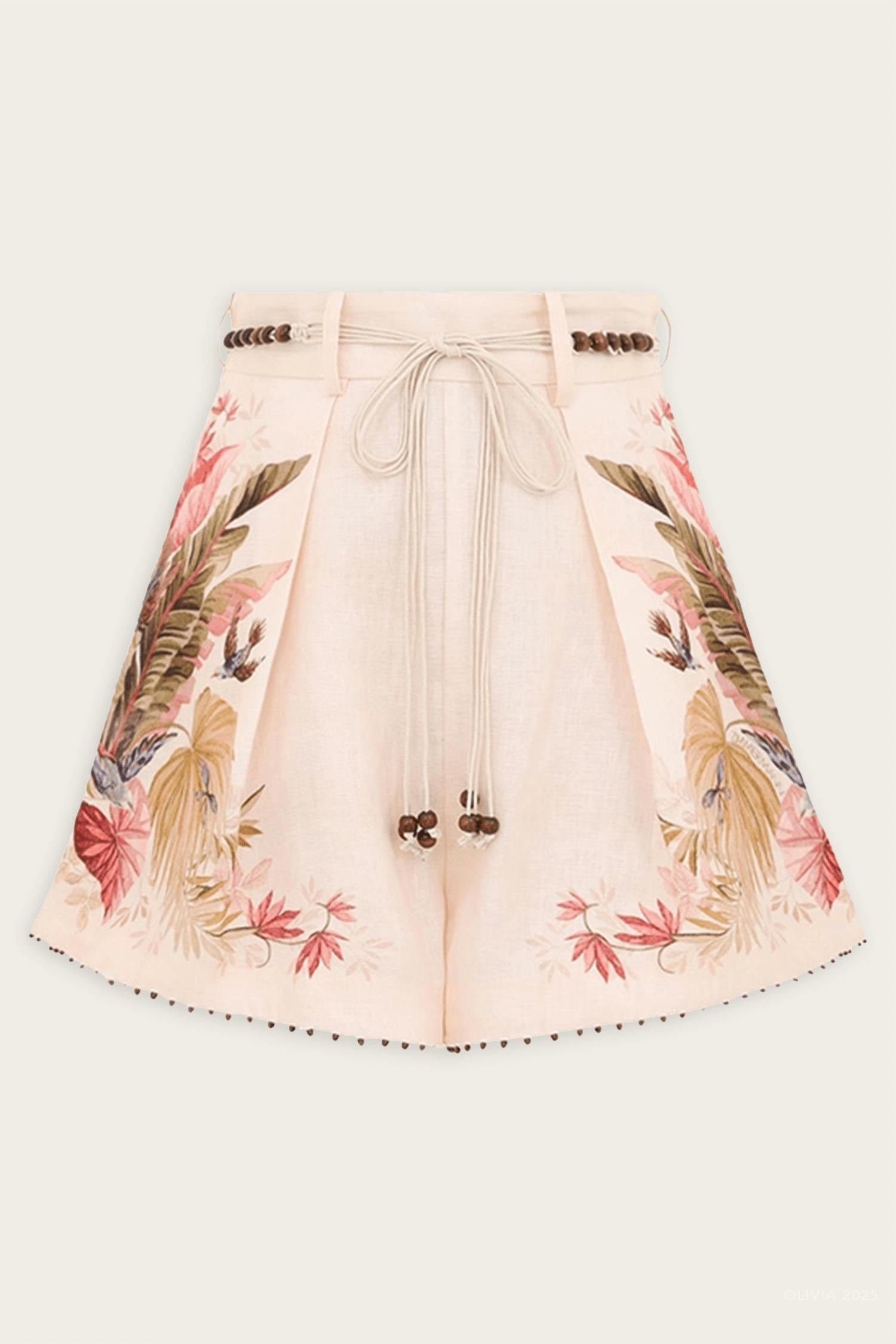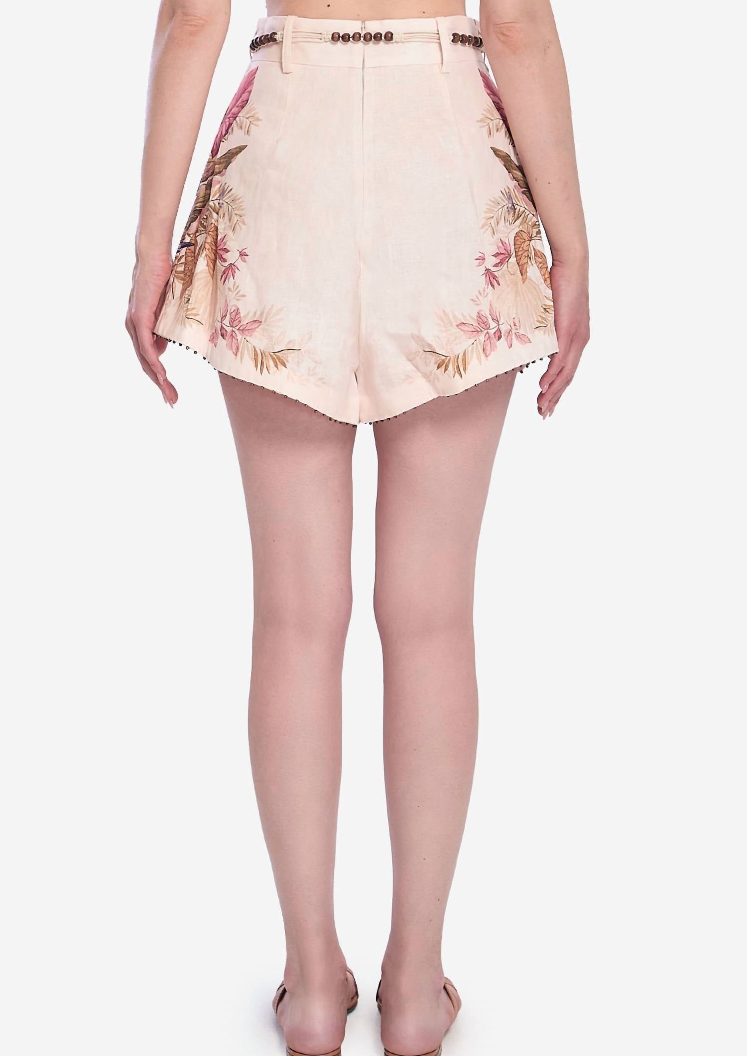 Fit to perfection, we love these high-waist shorts and you will too. Elevate your vacation wardrobe with the Ascension Tuck High Waist Short by Zimmermann in a charming Cream Palm Floral print. Crafted with a main composition of 100% Linen and lined with 100% Cotton, these shorts offer a perfect blend of comfort and style. Featuring a tie closure, this boho-chic piece is imported and designed to enhance any summer occasion. Care: Line dry.