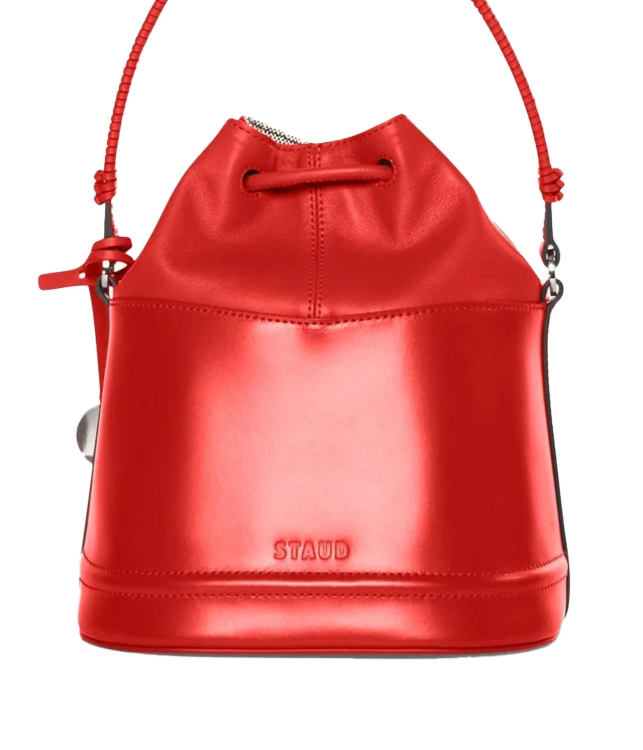 Cute and casual, this hobo bag is a fan favorite. Introducing the Women's Agnes Bucket Bag by STAUD, a bold accessory crafted from premium leather. Featuring a structured design, this vibrant Tomato red bag stands out with a drawstring closure, wrapped handle, and hammered medallion details. Despite its compact silhouette, it offers ample interior space, complete with a slip pocket and a removable, adjustable shoulder strap for versatile styling. Perfect for both everyday use and special events, this bag exemplifies STAUD's innovative design ethos.