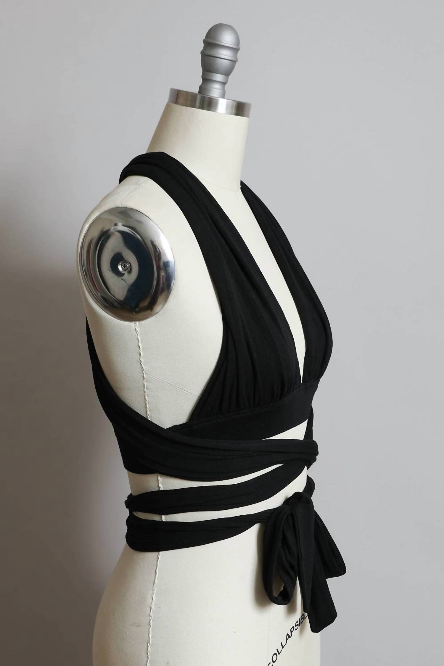 A sports bra that has it all - style, function and support. The LETO Multiple Ways Convertible Wrap Bralette in black offers versatile styling options for women seeking both comfort and adaptability. Crafted from a blend of 95% Nylon and 5% Spandex, it features a total strap length of 73.5" for customized wear. This solid pattern bralette fits cup sizes ranging from XS/S (32A-34B) to M/L (32D-38B).