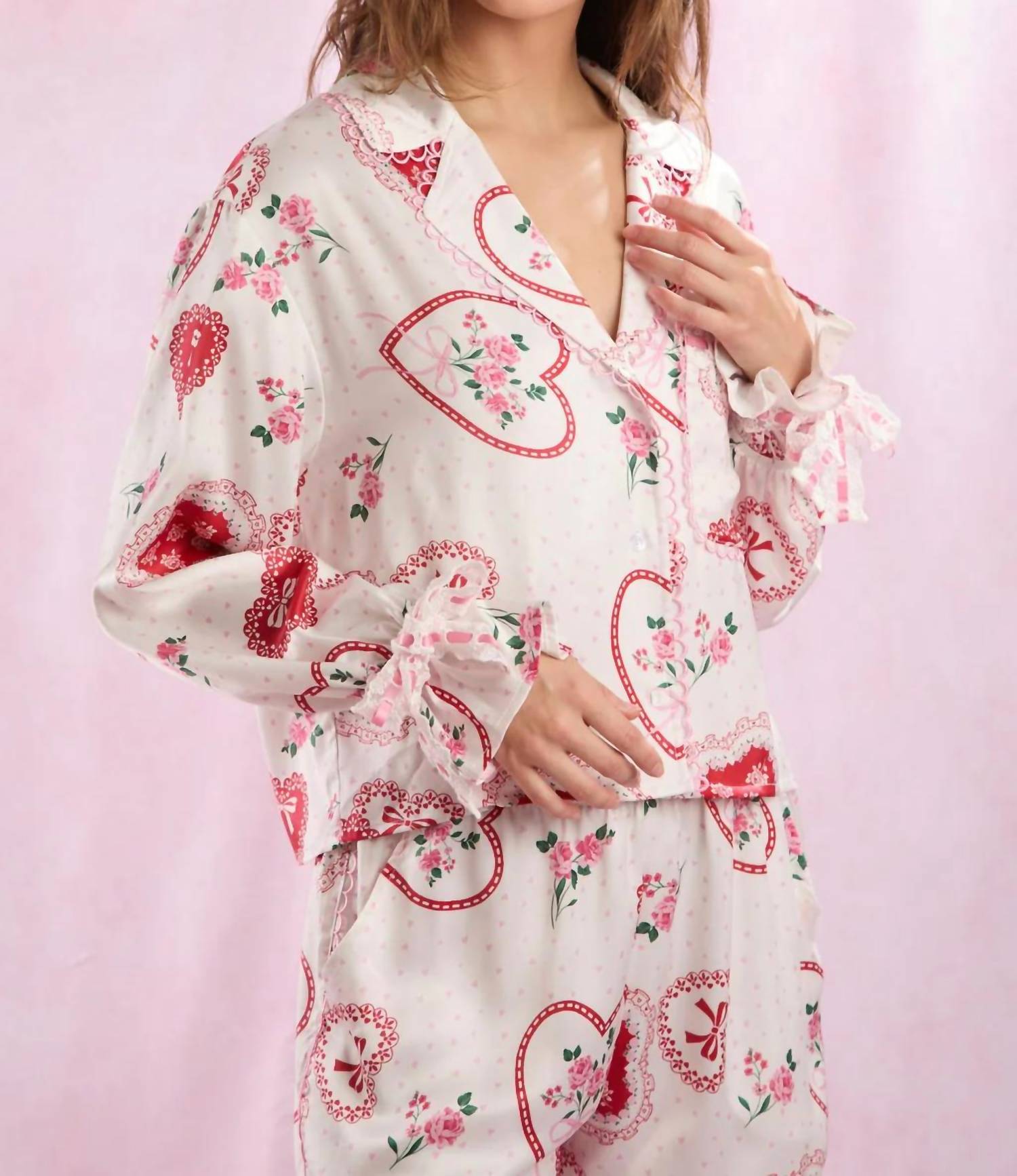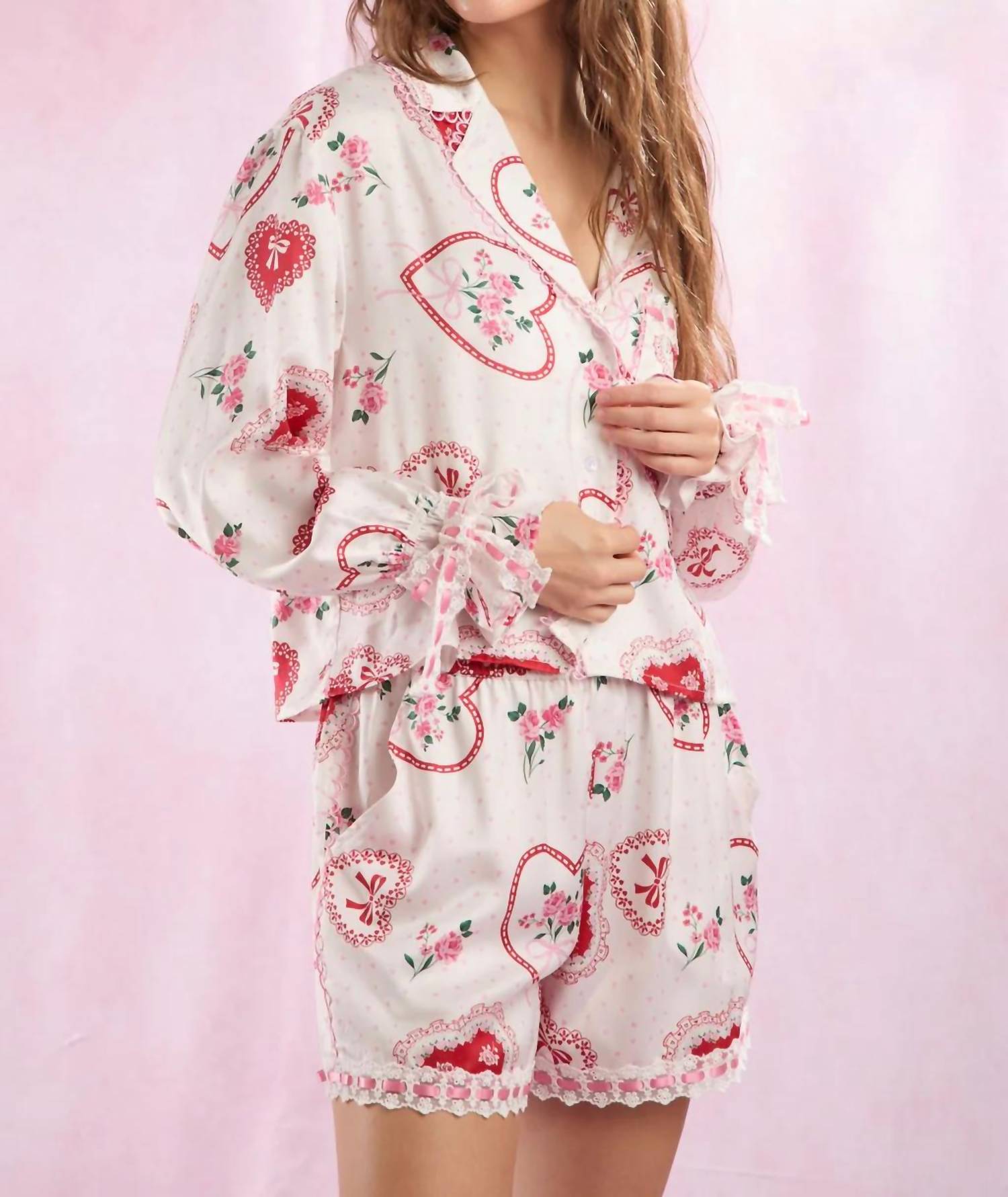 The perfect piece to lounge in, sleep in, and cook breakfast in. Designed in a charming white and pink pattern. Long sleeve shirt features a collared neckline, button closure, front patch pocket, and lace-trimmed cuffs. While the high waist shorts offer a pull-on style with delicate lace trim on the hem. Crafted from 100% polyester for a soft and luxurious feel. Care is simple with hand wash instructions.