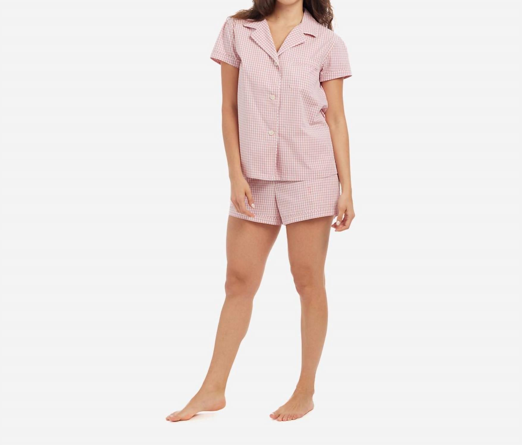 100% Cotton. This short sleeve pajama set features a relaxed fit, and includes a classic button-up top with a camp collar and chest pocket. The matching shorts feature an elastic waistband and drawstring for a custom fit, and convenient side-seam pockets. Size up for a more relaxed fit. Machine wash.