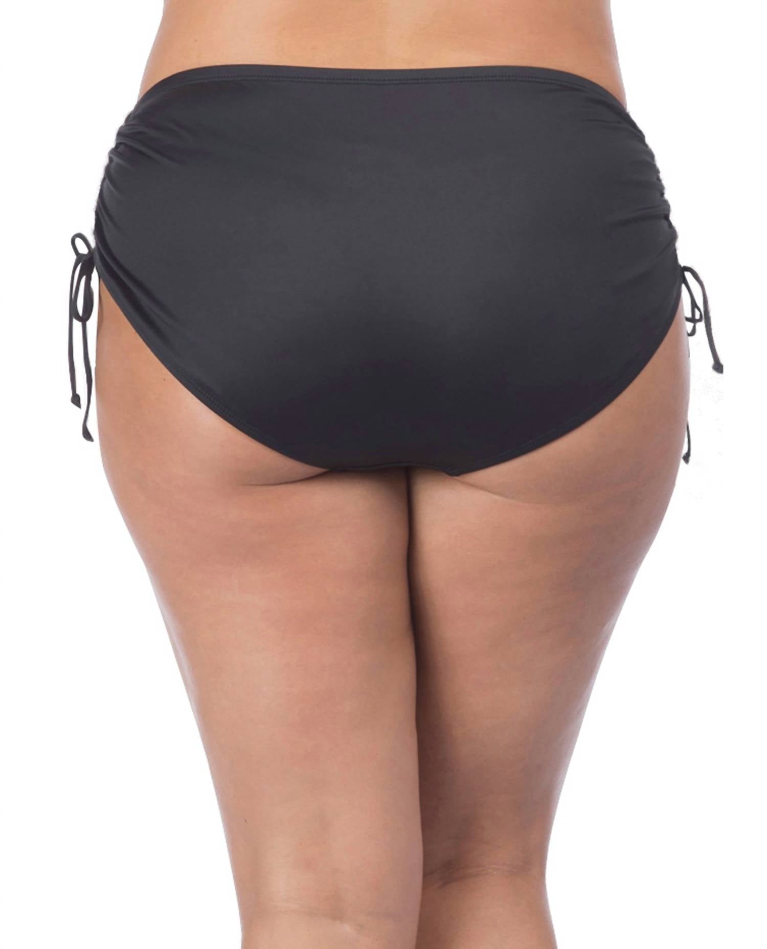 Visually slim torso with built-in tummy control. Brief featuring adjustable side tie. Provides moderate coverage. 85% nylon / 15% elastane. Machine Wash.