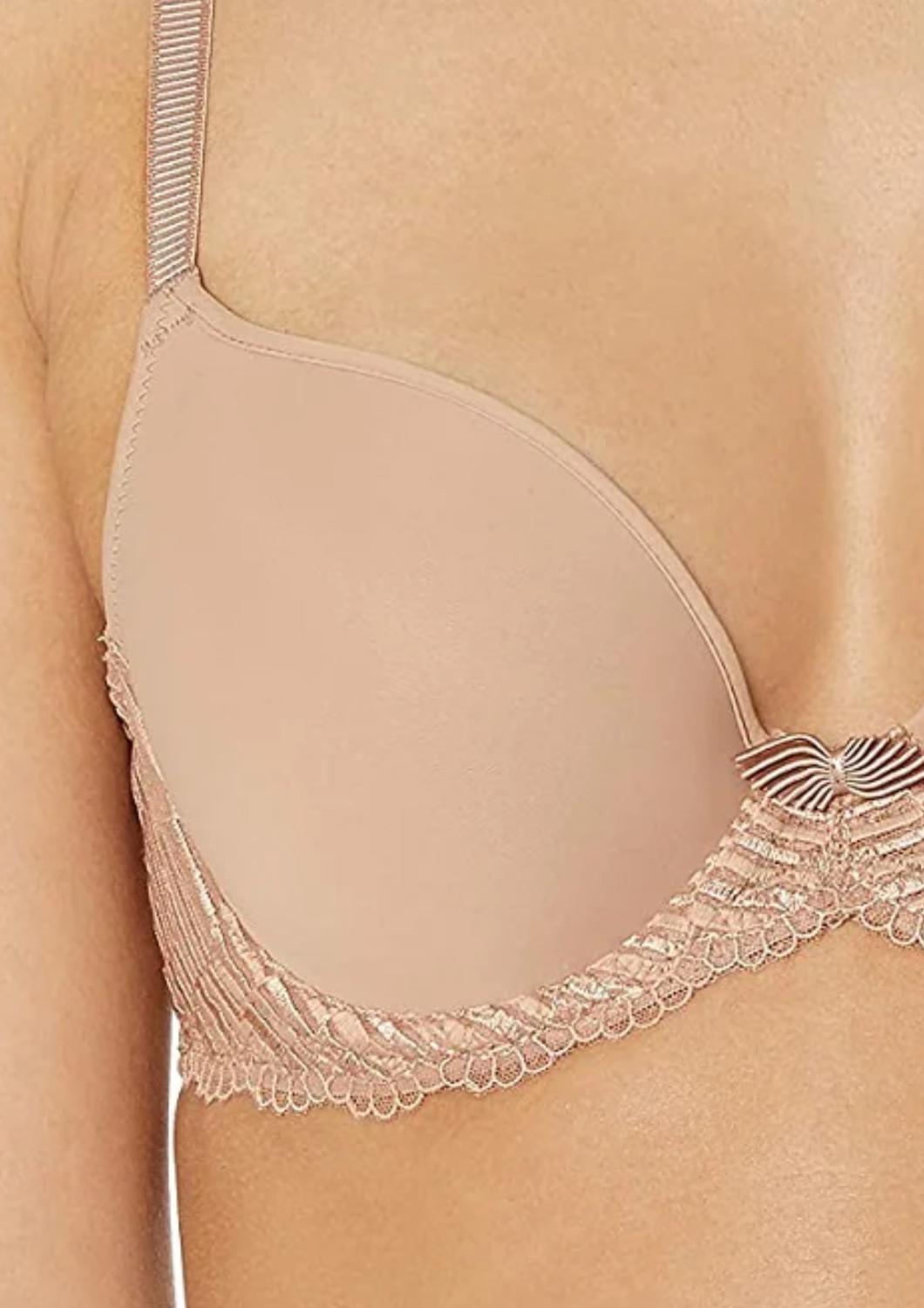 Both pretty and functional. Need we say more? Introducing the La Femme T-shirt Underwire Bra by Wacoal, a minimalist essential in a Natural Nude hue. Crafted from a comfortable blend of 84% Nylon and 16% Spandex, this bra features stretch foam cups with a pleated bow accent for a touch of femininity. Designed with adjustable stretch pleated straps, it offers a perfect fit and a deep plunge neckline for versatile styling. Care: Hand wash to maintain its quality and shape.