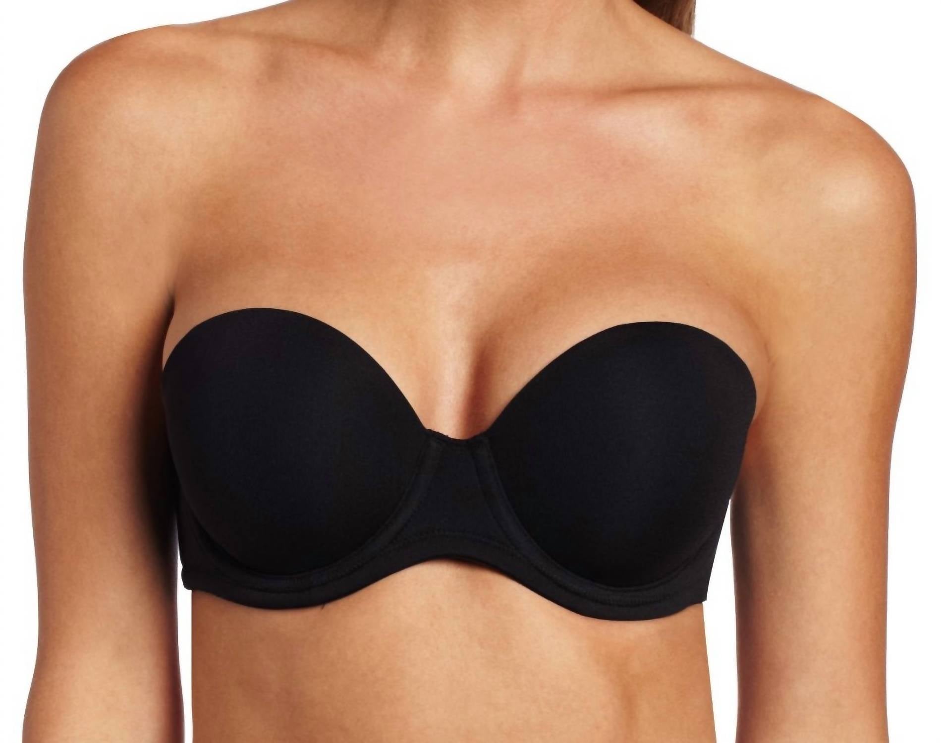 Both pretty and functional. Need we say more? Elevate your lingerie collection with the Full-busted Strapless Bra by Wacoal, designed in a minimalist solid black for versatile wear. This strapless piece includes removable, adjustable straps and features a cushioned lower band for added comfort and support. Made from a seamless blend of 85% nylon and 15% spandex, it boasts contour cups and a Mobilon strip for shaping and stability. With an underwire, hidden stays, and a three hook-and-eye back closure, this bra provides both style and security. Care: Hand wash.