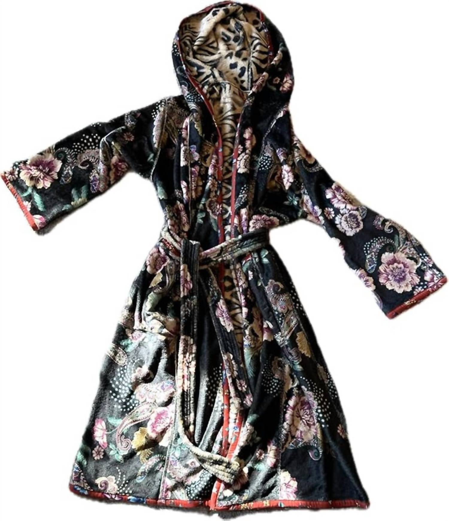 This Aditi Camino Serra Reversible Robe is crafted from 100% polyester with a hooded neckline and open lapel front. Fully reversible, it features pockets, a waist tie, and a chic patterned design. Machine washable for easy care.