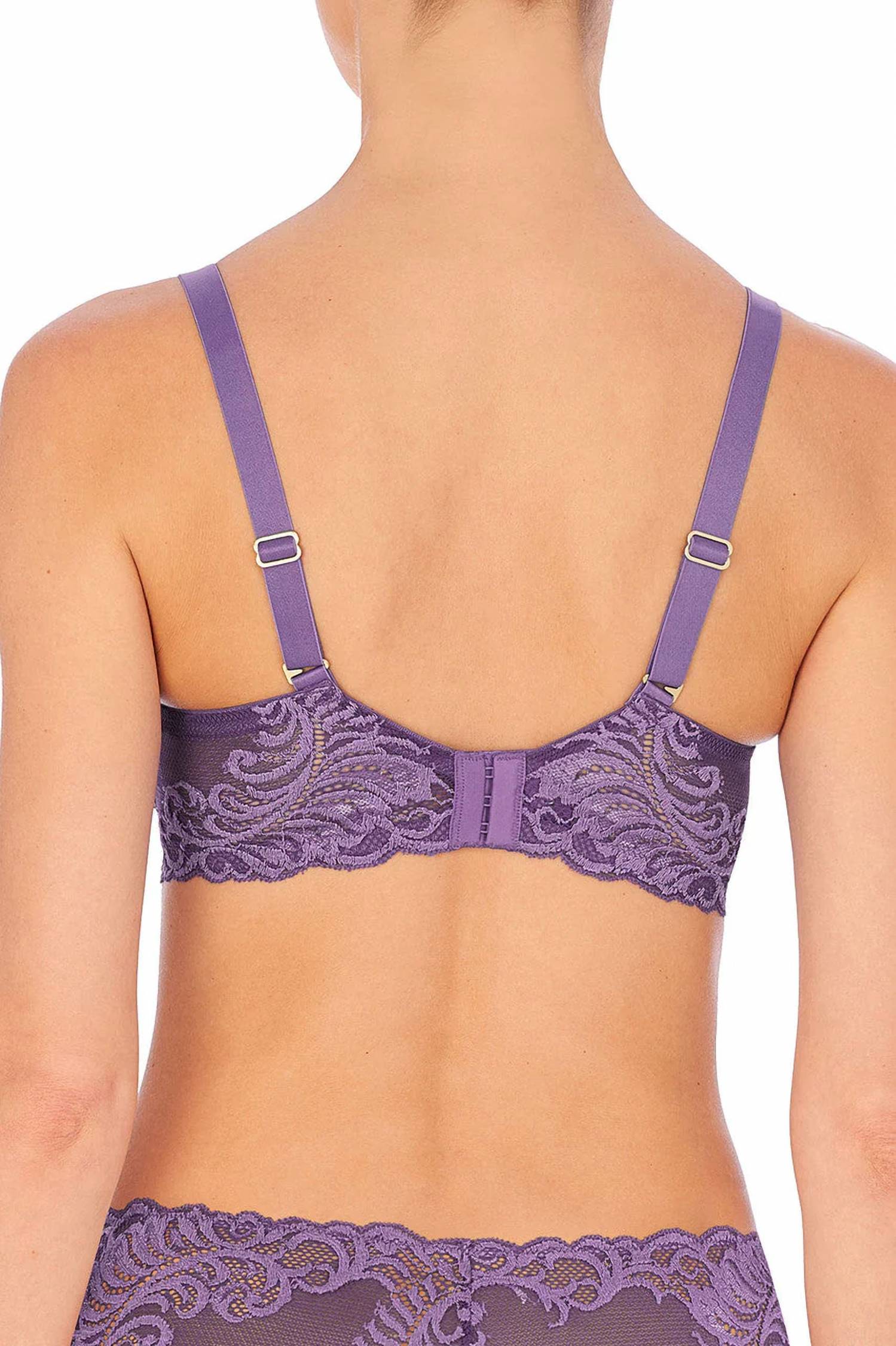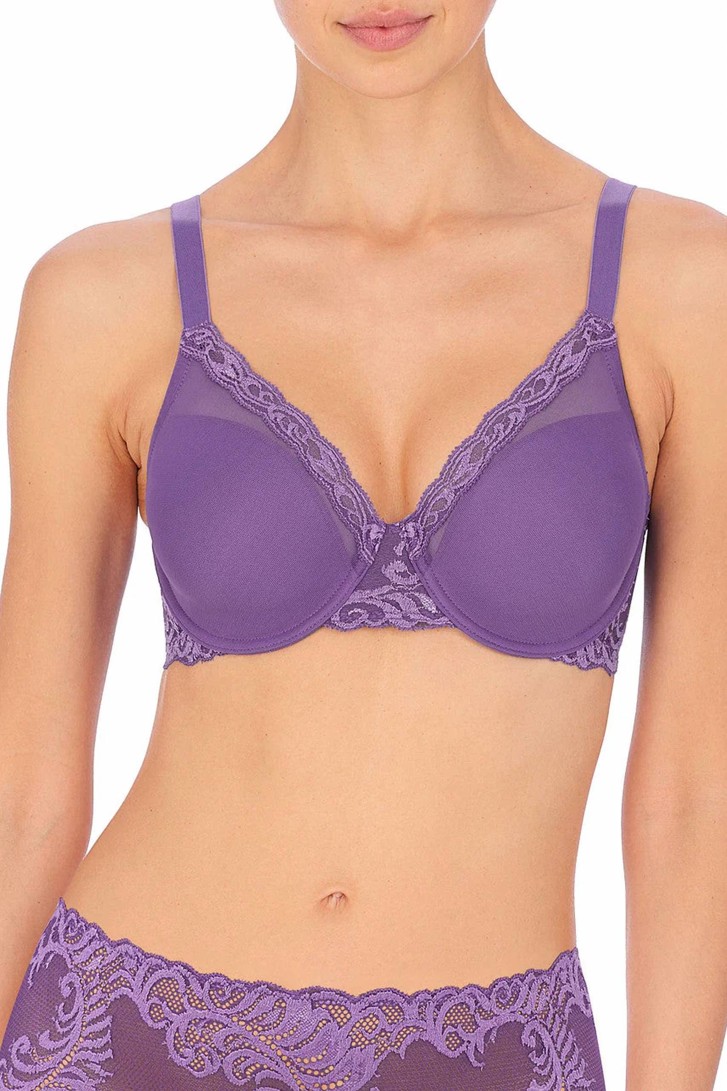 Both pretty and functional. Need we say more? Experience unmatched support and smoothness with the Natori Feathers Full Figure Contour Underwire Bra in Blue Lavender, expertly designed for extended sizes. The seamless t-shirt style features mesh overlays on stretch foam cups, ensuring shaping and control that remain invisible under clothing. The garment comprises lace made of 93% nylon and 7% spandex, with lace trim of 95% nylon and 5% spandex, mesh of 84% nylon and 16% Lycra® spandex, and a cup lining of 100% polyester. Benefit from adjustable semi-rigid straps and wide lace backs lined with mesh for added comfort in larger sizes. This bra is crafted for women and requires gentle care: hand wash and line dry for optimal longevity.