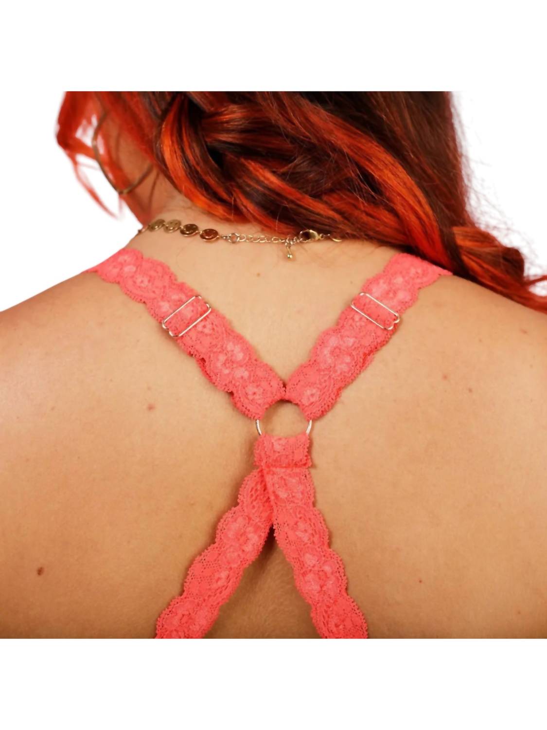 This bra will be your new top-drawer favorite. Beautiful lace detail throughout, including straps. Racerback and crisscross strap design. Super stretchy and comfortable with ample lift and support. Long lace bottom stays in place. Adjustable straps with Unipad Design for secure, removable padding. 90% Nylon, 10% Spandex.