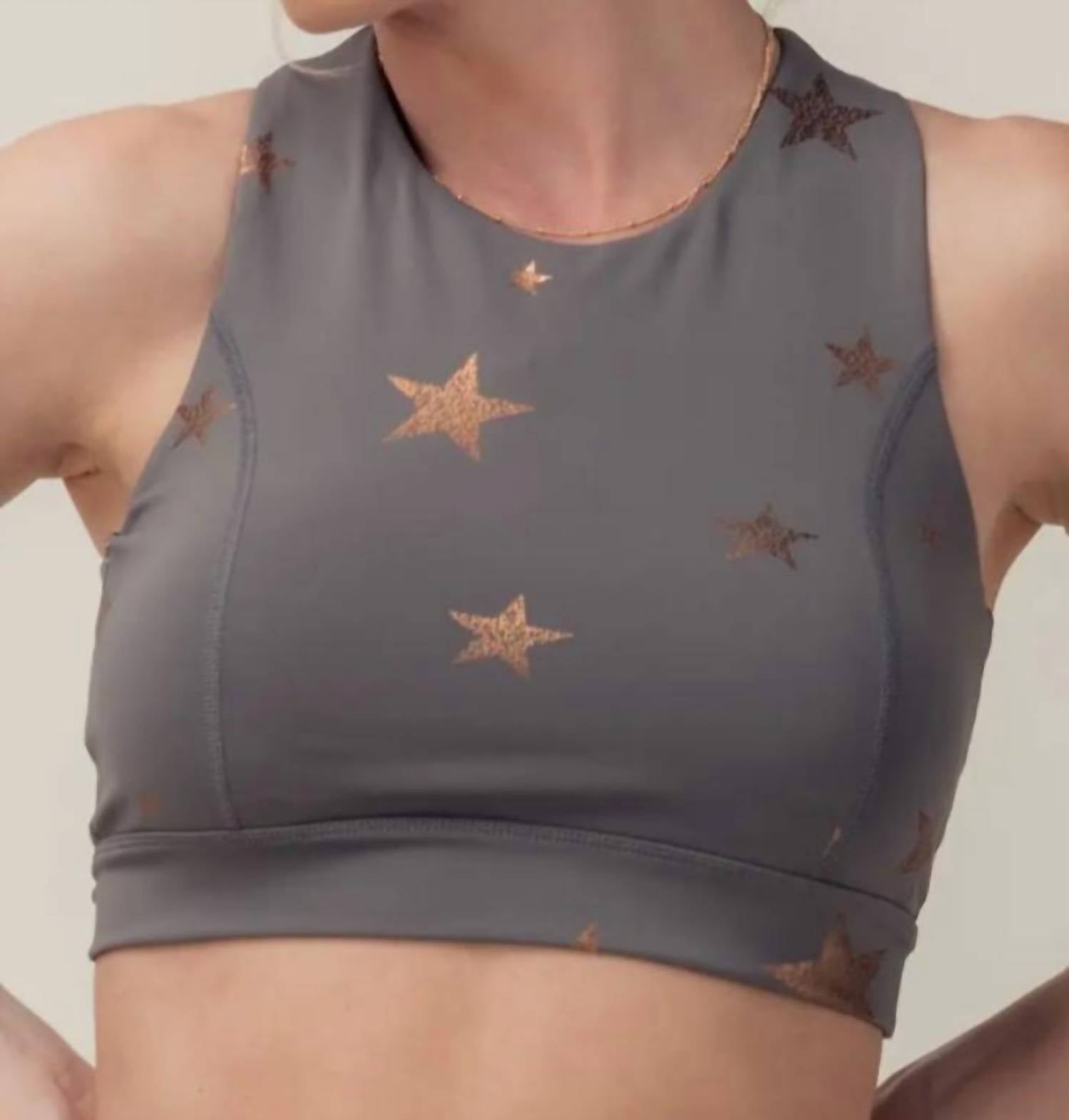 The most comfortable and supportive sports bra you'll own. Elevate your workout wardrobe with the Starry Night Foil Sports Bra by Mono B, designed to offer style and support in a chic grey hue. Crafted from 80% polyester and 20% spandex, this patterned sports bra ensures maximum comfort and flexibility for all movements. Ideal for the fashion-forward fitness enthusiast, it features a stunning starry night foil design. Made with high-quality materials, this sports bra is a must-have for every active woman.
