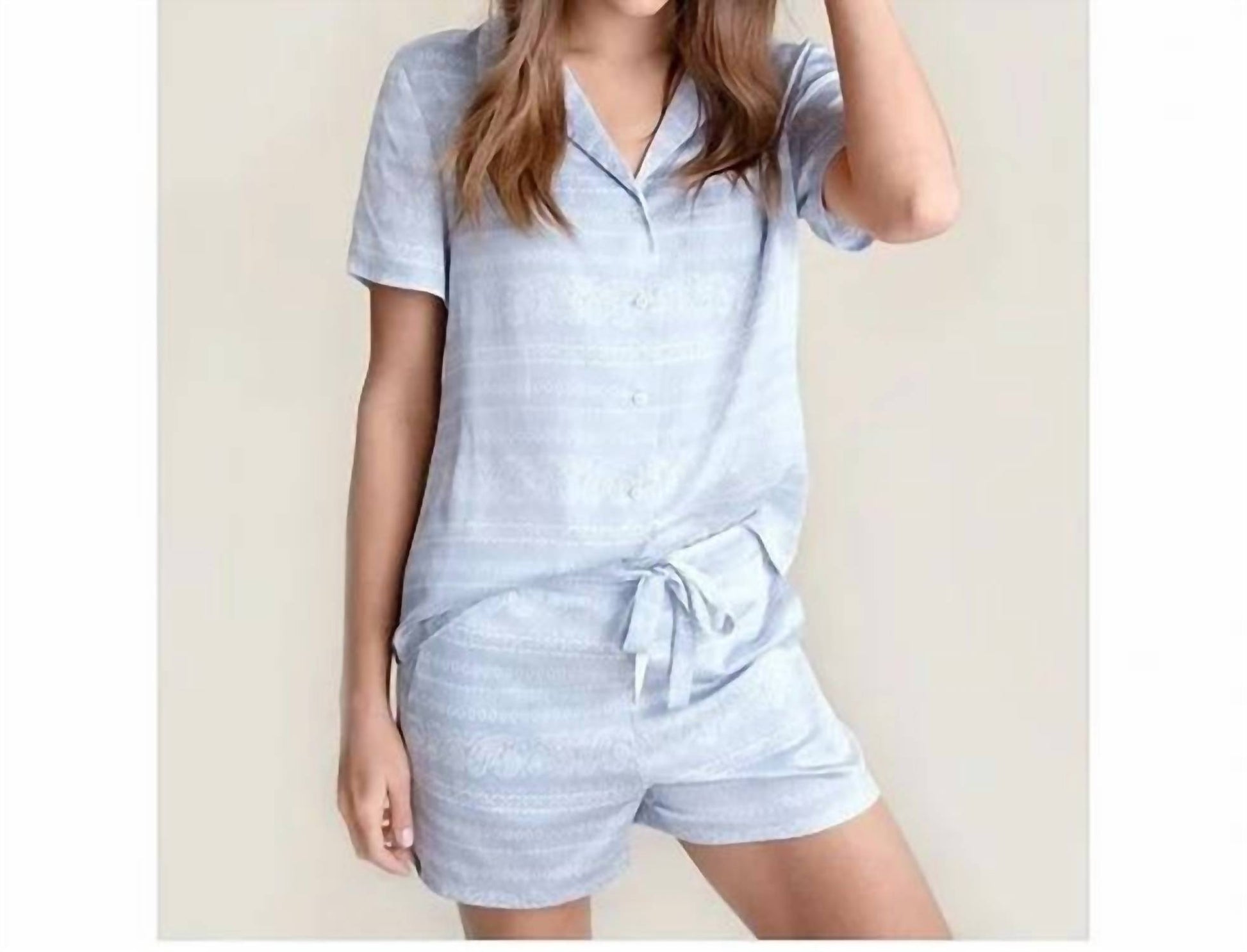 Works well with naps, zoom calls and binging your favorite series. Experience luxurious comfort with the BAREFOOT DREAMS Washed Satin Short Pajama Set in Chambray Bandana. Designed with short sleeves and a collar neckline, this set is made from silky polyester, offering breathable relaxation. Equipped with a front pocket and drawstring waist, these striped pajamas combine convenience with style. Perfect for vacation or spring lounging, care for them easily with a machine wash for lasting softness.