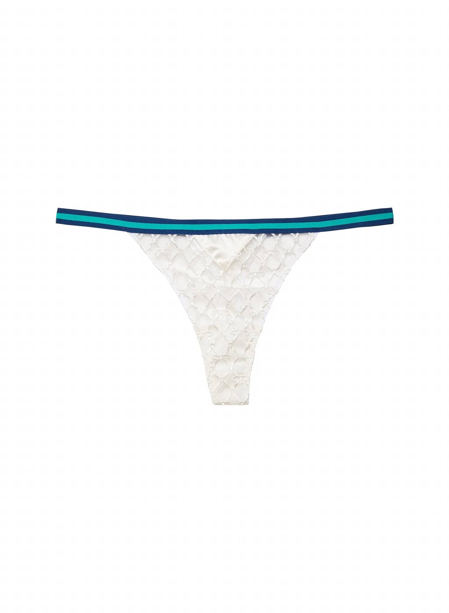So comfortable you'll want one in every color. Discover the Women's Match Point Thong by Fleur Du Mal, a chic addition to your lingerie collection in a sophisticated ivory hue. This textured pattern panty, made from polyester, features a low-rise waist for a flattering fit. Enjoy an extra cheeky coverage that pairs perfectly with the daring Y2K trend. Care for this piece by hand washing and laying it flat to dry for lasting quality. Body: 100% Polyester. Combo: 92% Silk & 8% Elastane. Gusset: 100% Cotton.