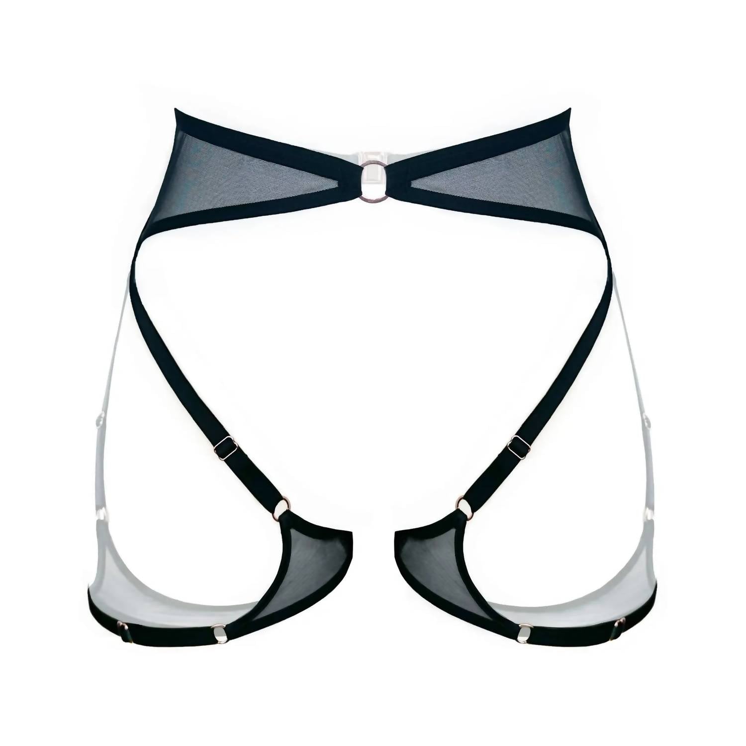 Presenting the Ether Harness by Monique Morin, part of the exclusive Erin O'hara collaboration, designed for a bold statement. With fine shaping mesh and a high-rise fit, this solid black piece offers fully adjustable comfort and contour. The harness features elegant rose gold hardware and a secure back clasp closure. Ideal for special occasions, it comes with care instructions to hand wash.