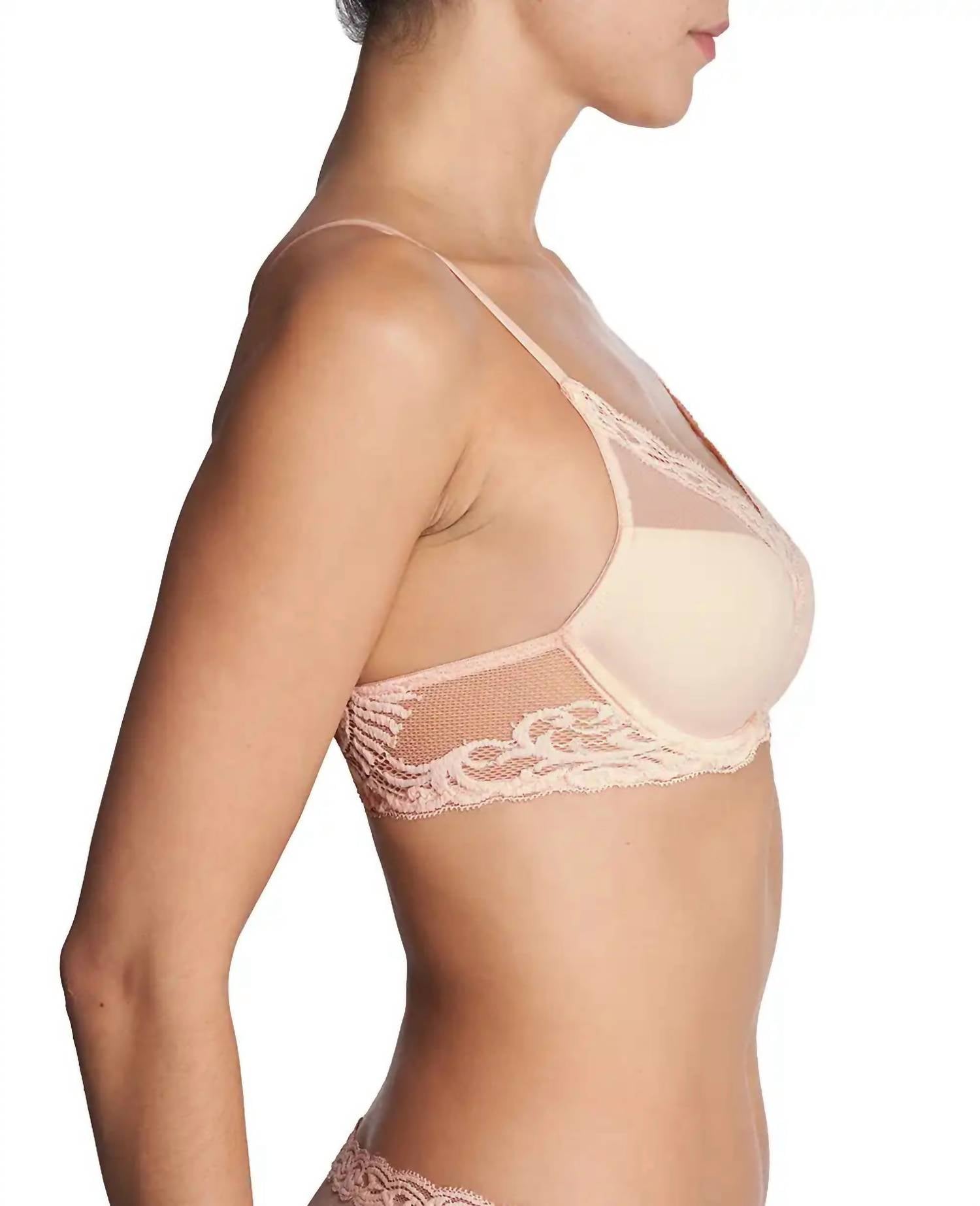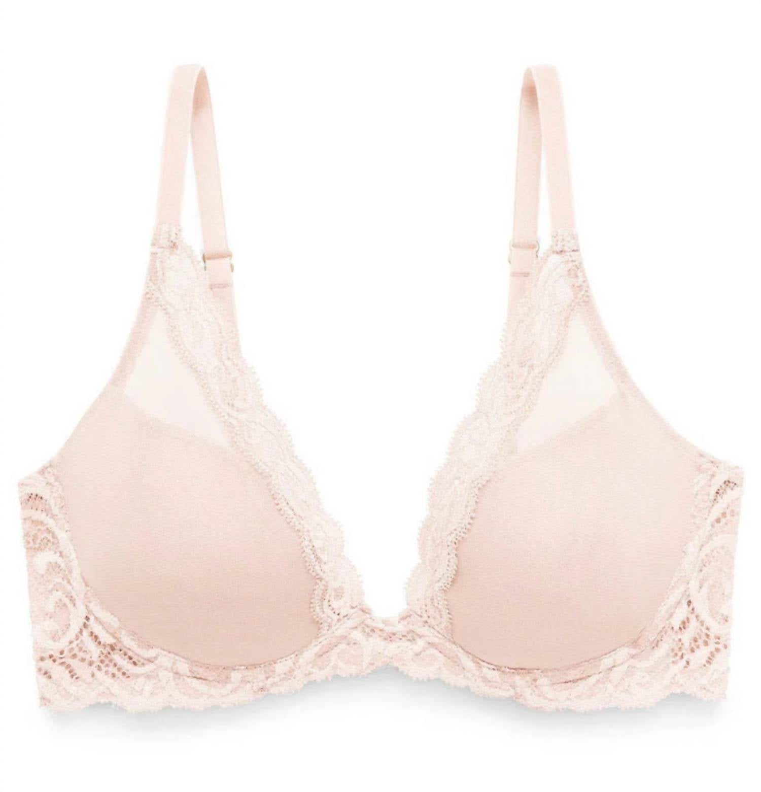 The most comfortable and stylish bra that you'll reach for daily. Introducing the Natori Feathers Plunge T-shirt Bra, an alluring addition to your lingerie collection in the sophisticated Rose Beige Lace Pink Pearl shade. This bra boasts a demi contour with smooth, lightweight contour pads and a deep plunge neckline for a natural, flattering shape. Crafted from a luxurious nylon blend with elegant Italian lace trim, it features fully adjustable stretch straps for a custom fit. Please note this style runs small; consider ordering one cup size up for optimal comfort. Composition: Mesh 84% nylon, 16% lycra; Lace 91% nylon, 9% elastane; Lace trim 94% nylon, 6% elastane. Care: Hand wash and line dry.