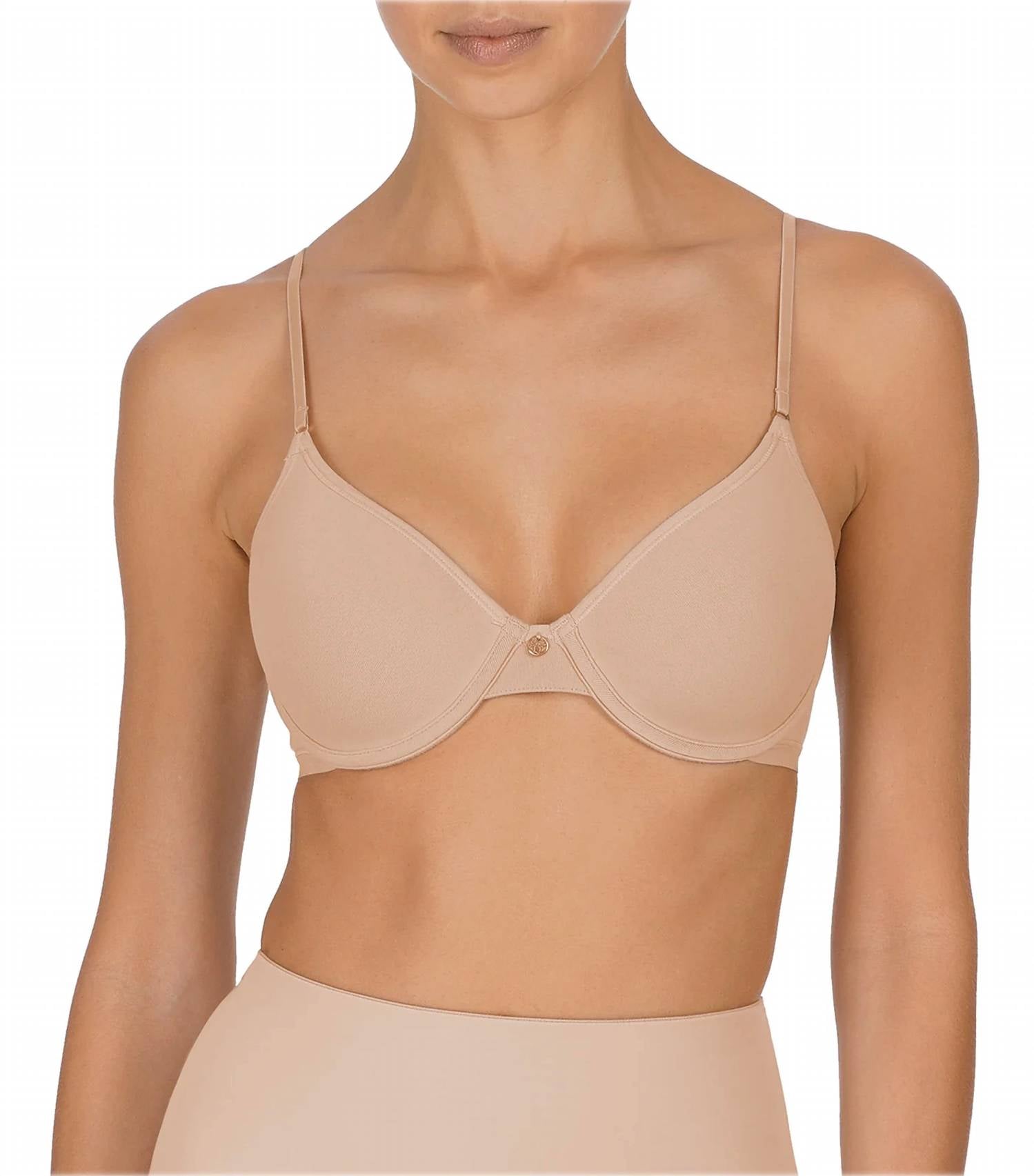 Both pretty and functional. Need we say more? Experience elegance with the Natori Understated Underwire T-shirt Bra in Café Nude. This bra is crafted from 96% supplex and 4% lycra, offering a sleek fit with narrow stretch straps and a refined gold engraved crest at the center. For smaller sizes, it features a single hook and eye closure, embodying a chic minimalism perfect for any wardrobe. Care for it by hand washing and line drying for the best results, making this bra an essential piece this summer.