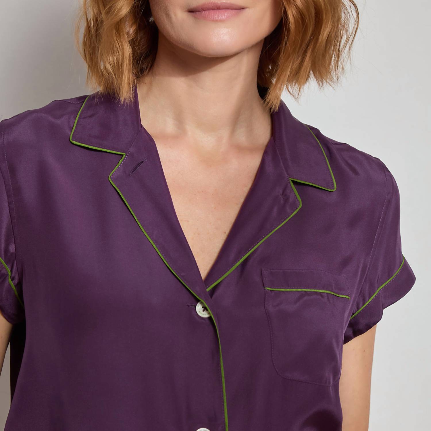 Works well with naps, zoom calls and binging your favorite series. Embrace the ultimate comfort with The Sleep Code's Washable Silk Short PJ Set, an elegant choice in Nightshade. Featuring short sleeves and crafted from 100% pure mulberry silk with a matte finish, this luxurious set includes a classic button-up top with a collar and coordinating shorts with an elastic waistband and drawstring. Originating from fine silk and designed for women, its hypoallergenic properties make it perfect for sensitive skin.