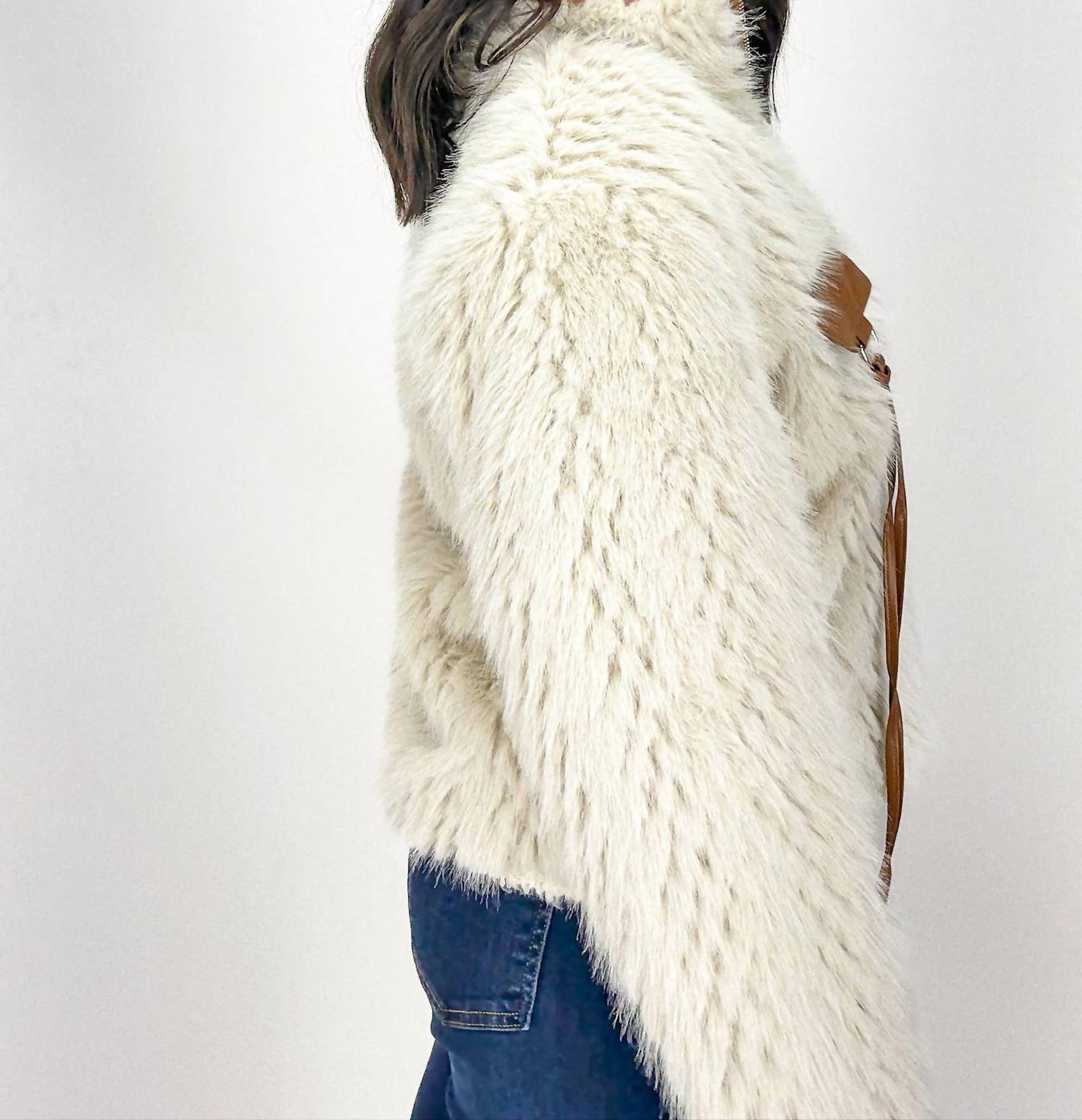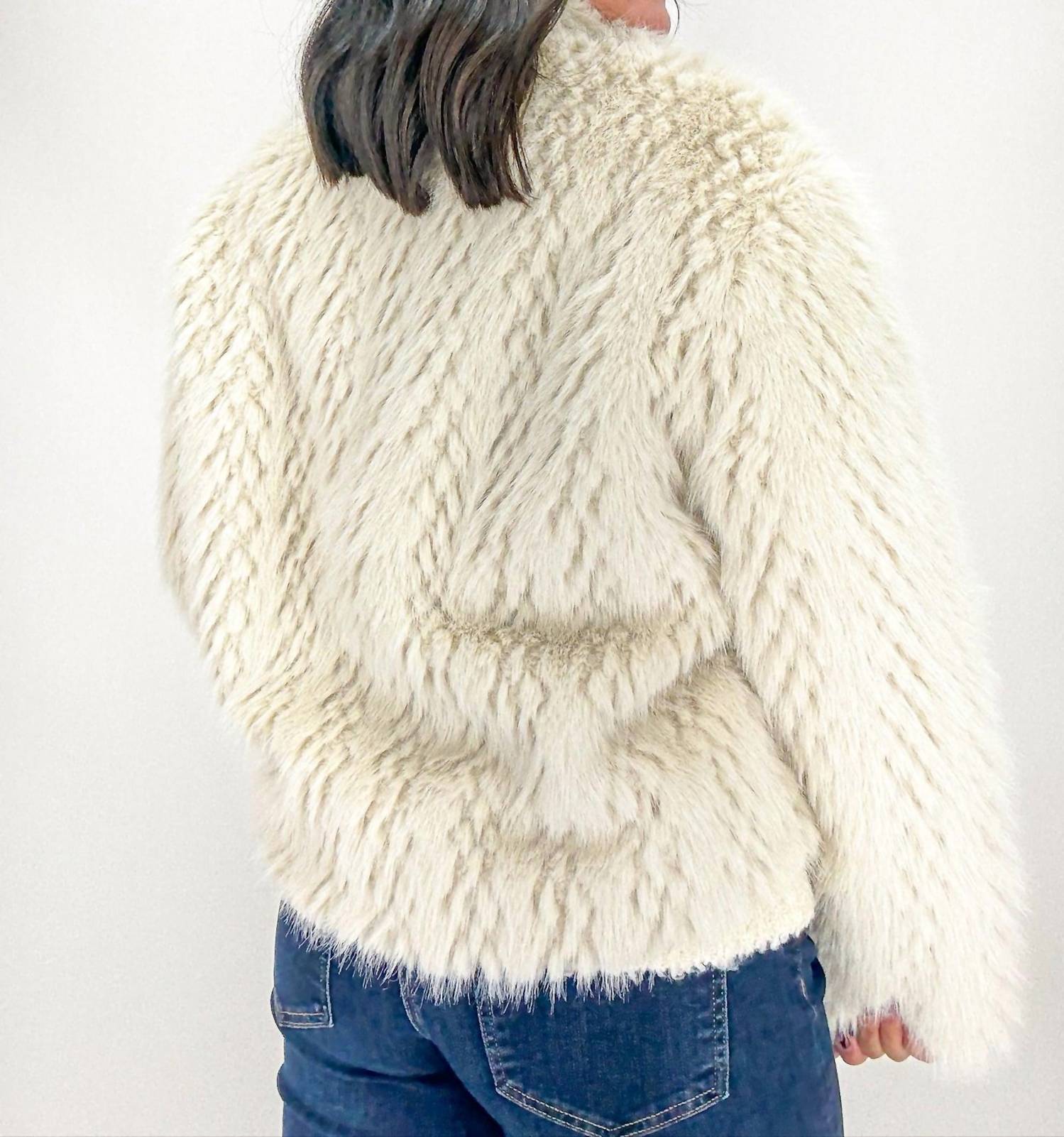 Bundle up in this adorable teddy jacket that'll have you wishing for colder temps. Introducing the Annika Faux Fur Jacket by ASTRID, a statement piece perfect for your winter wardrobe. This luxurious jacket features a classic cream hue with brown leather detailing and long sleeves. The zip closure adds functional flair while the V-neck design enhances your style. With its textured faux fur and practical pockets, this jacket is ideal for vacation and perfect for celebrating the holiday season.