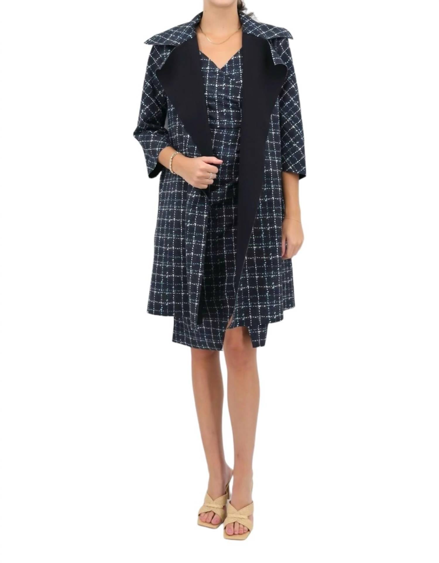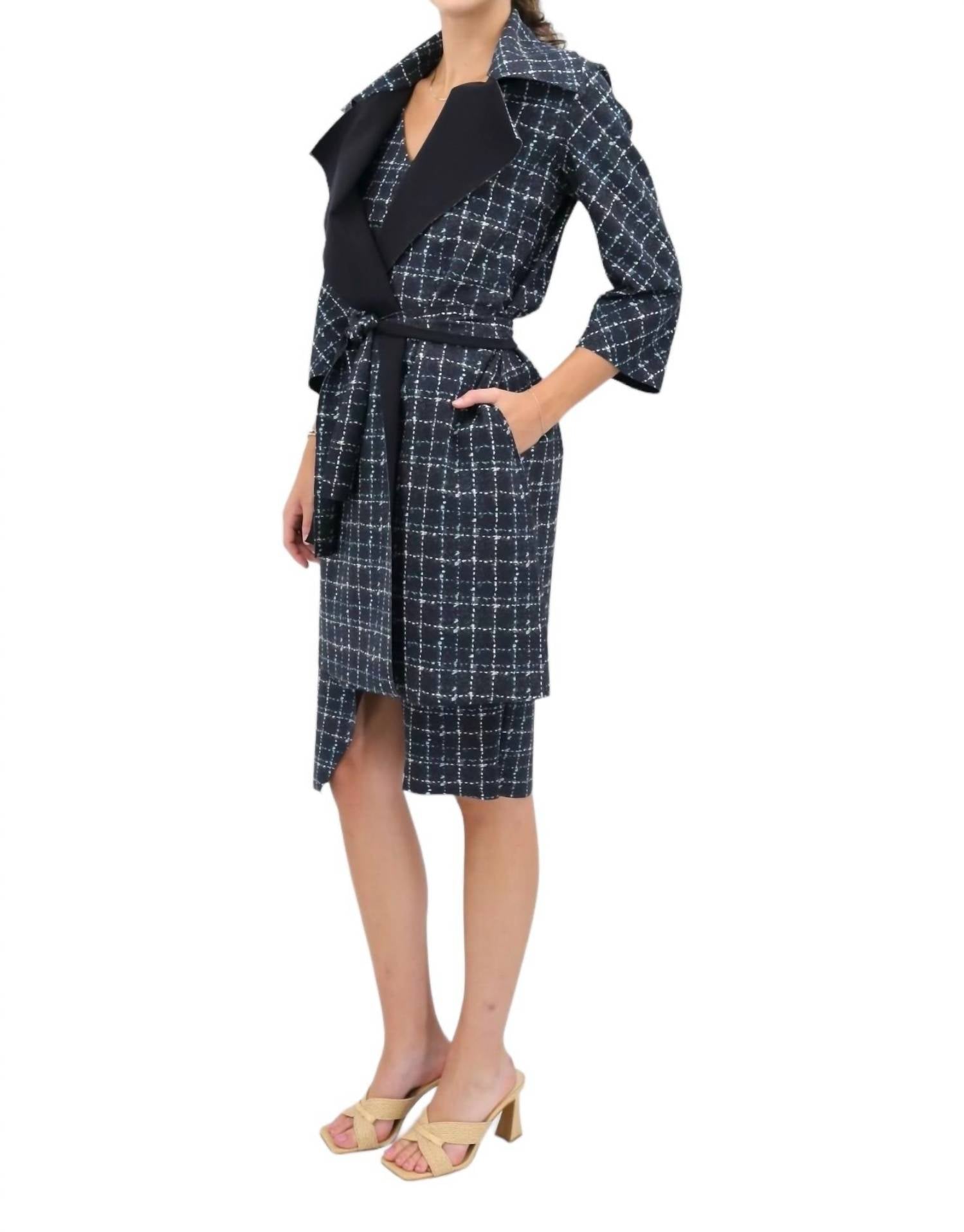 The perfect trench coat that you can throw over any outfit. Elevate your outerwear collection with the Women's Saveria Belted Trench Coat by CHIARA BONI, designed in a sophisticated navy shade. This stylish trench features long sleeves and is crafted from a textured stretch jersey, enhanced with broad lapels and a detachable sash belt for versatile styling. Tailored with a V-neck and tie closure, the coat boasts a raw-edge hem for easy tailoring and is wrinkle-resistant, making it perfect for vacation and winter seasons. Care: Machine wash at 30° (86°F). Model is 5'9" (177 cm) wearing size 4 US.