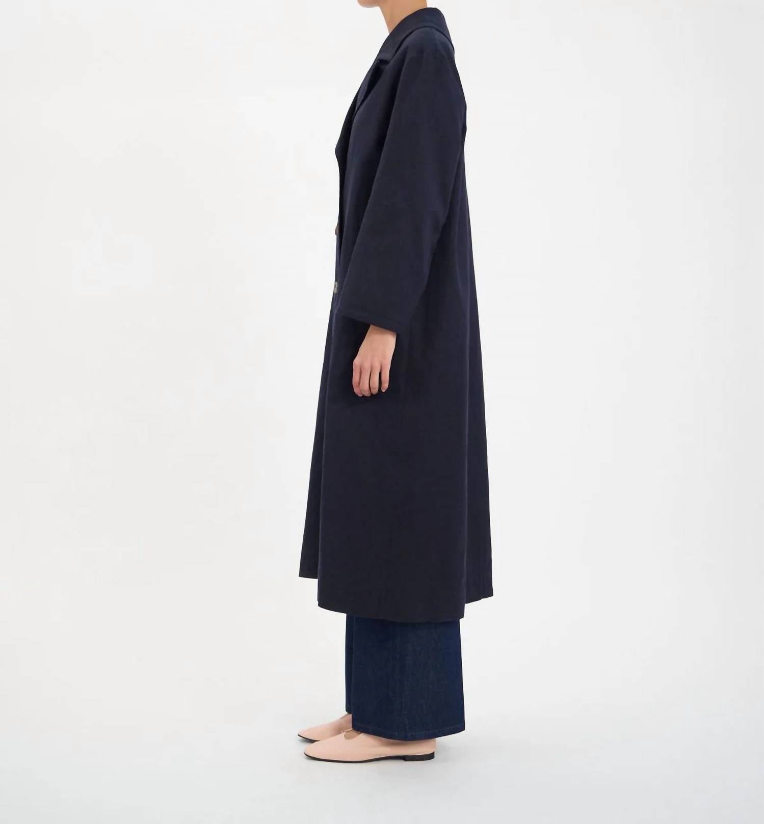The perfect trench coat that you can throw over any outfit. The Denise Coat by Ines de la Fressange is a sophisticated addition to your wardrobe, perfect for a minimalist fall look. This navy blue trench features a double-breasted button closure and a coat collar, elegantly crafted from a blend of cotton and linen. With its long sleeves and raglan front pockets, this wide-cut coat offers a modern, loose fit. Made in France, it combines style and comfort effortlessly.