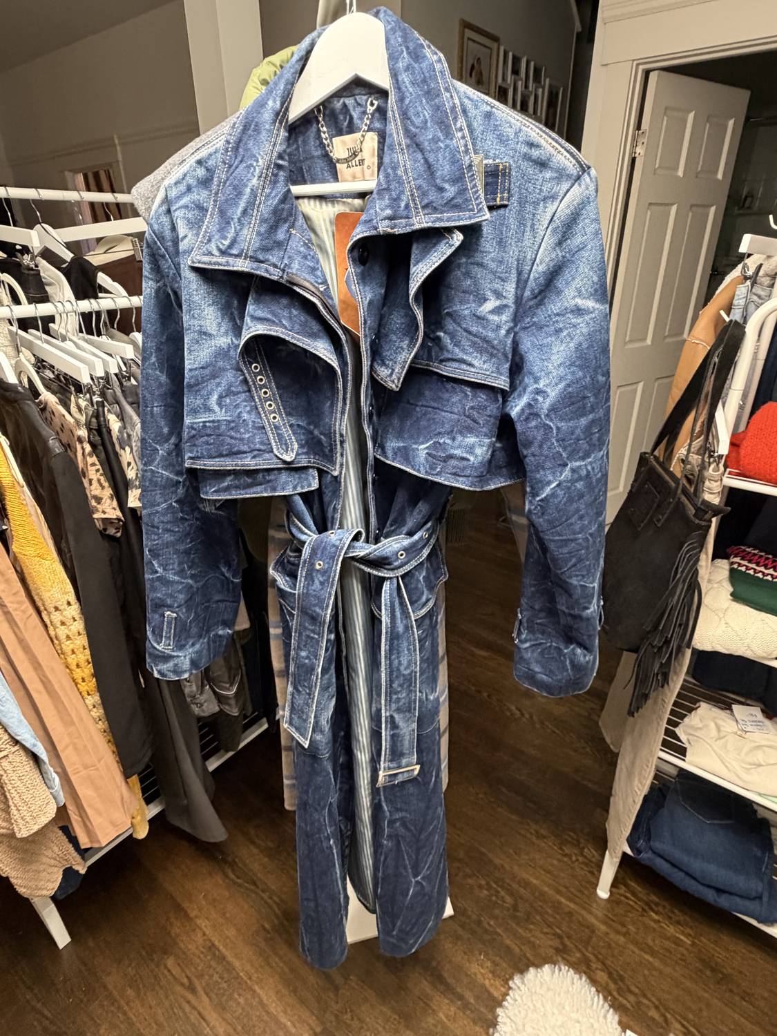 A timeless classic. You'll be reaching for this trench every season. Elevate your fall wardrobe with the Women's Belted Double Breasted Trench by Julia Allert, crafted in a chic Denim Wash. This trench features a classic solid pattern with a stylish collar neckline and practical pockets. Designed with long sleeves, it's perfect for streetwear and travel occasions, ideal for the Thanksgiving season. Made for women, this trench coat combines timeless style and practical functionality.