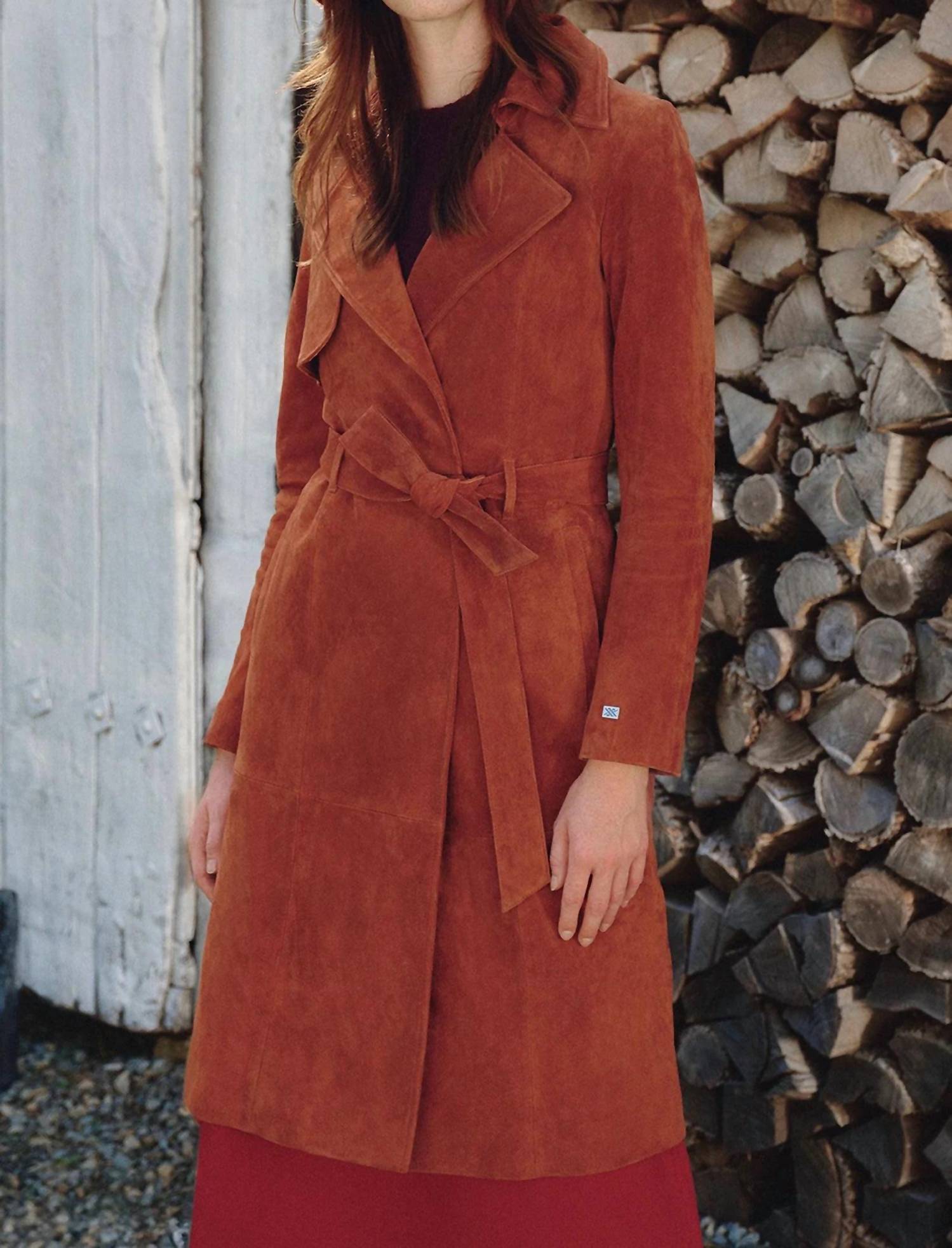 Classicly chic, this is the kind of trench coat that never goes out of style. The Alexis-n Slim-fit Suede Trench Coat by SOIA & KYO offers a sophisticated style in a textured copper hue, perfect for travel or workwear. It features long sleeves and a knee-length, slim silhouette, crafted from fabulously soft 100% suede with a 100% polyester lining. The double-breasted design includes a Napoleon collar and cleverly hidden magnets for closure, complete with a detachable tie belt for a custom fit. Thoughtfully designed with angled welt pockets and a front storm flap, this piece should be dry cleaned by a leather specialist. Model is 5'8" and wears a size XS; coat length from shoulder to hem measures 38 inches.