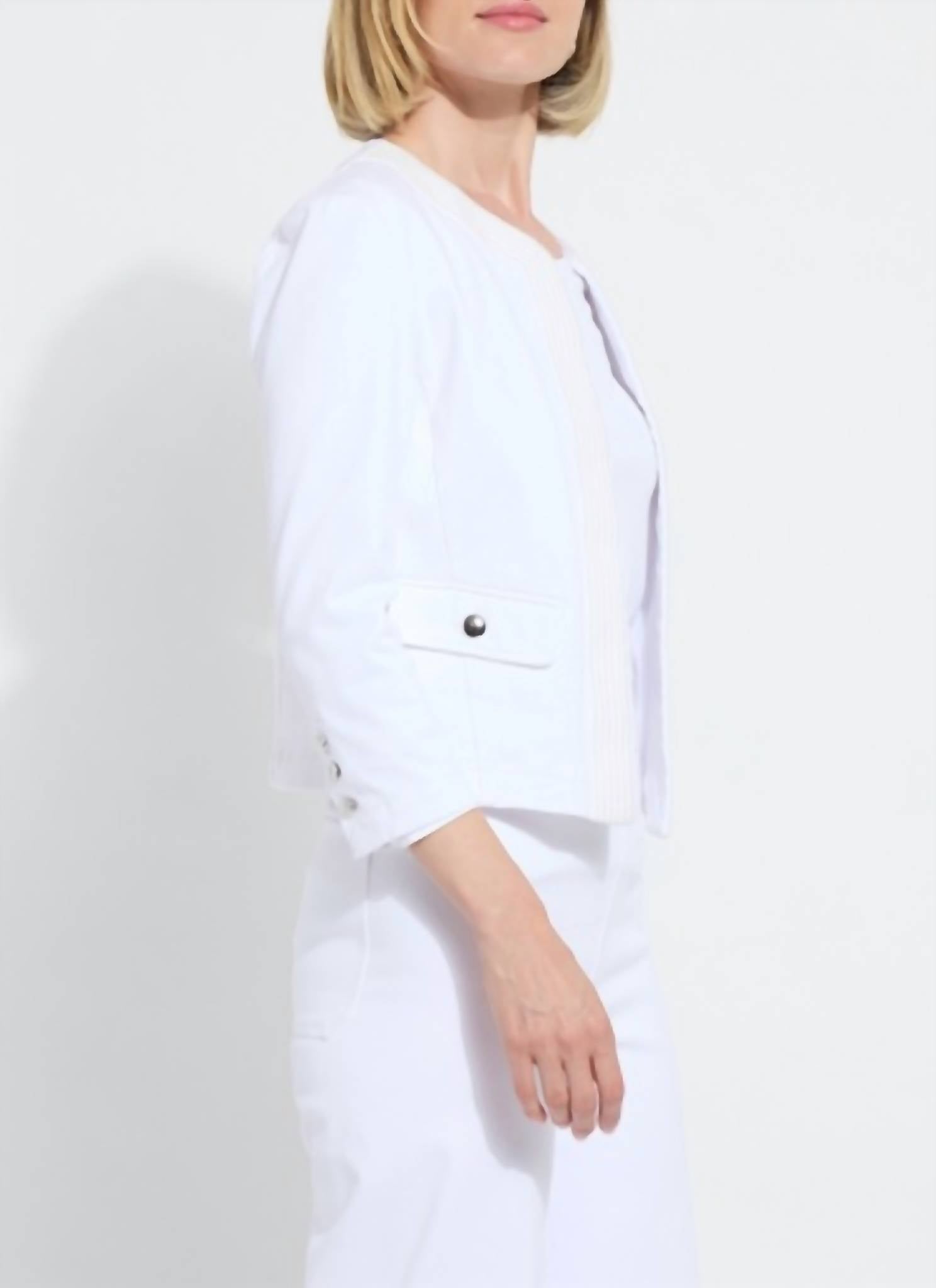 Classic, cool and works with almost any outfit choice. Introducing the Arbor Embroidered Denim Jacket by Lysse, a stylish addition to any wardrobe with its chic open front and tonal embroidered trim. This women's jacket in solid white features three-quarter sleeves and is crafted from a 95% cotton and 5% spandex knit denim blend, ensuring comfort and four-way stretch. With a convenient pull-on closure, it fits true to size and includes pockets for added functionality. Care is simple with machine wash and line dry instructions, making it a practical choice for dinner parties or casual layering.