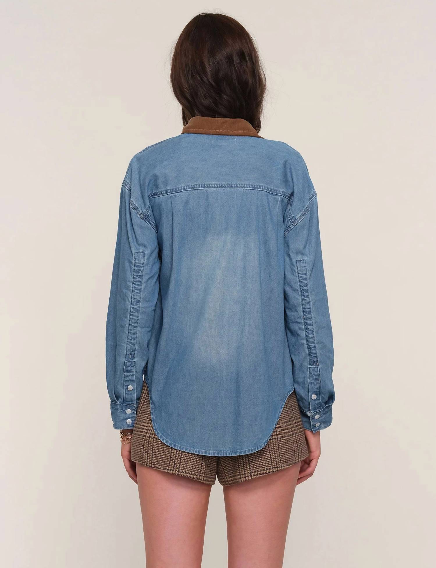 The perfect jean jacket for those slightly crisper days between seasons. Introducing the Bonet Chambray Shirt by Heartloom, a minimalist staple perfect for summer travels in a stunning azure hue. This long sleeve shirt is expertly crafted from durable cotton, making it both stylish and comfortable for any occasion. Designed for women, it features a solid pattern and practical pockets, accented with a classic collar neckline. Closure: Button closure. Care: Hand wash, lay flat to dry, or tumble dry.
