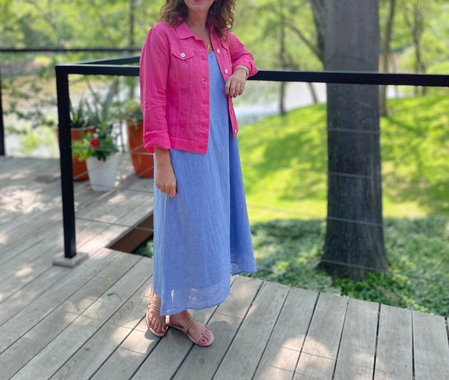 Throw this adorable jacket over just about anything for an effortlessly stylish look. Introducing the Linen Jean Jacket by Pure Amici in a delicate Petal shade, a fresh take for spring and summer. This jacket features long sleeves and hits at the hip, crafted from 100% linen which offers both comfort and style. Designed with a straight collar, faux front pockets, and a button-down front with button closures for a classic look. Care: Machine wash cold. Model Cathleen is 5'4" and wearing a size small.