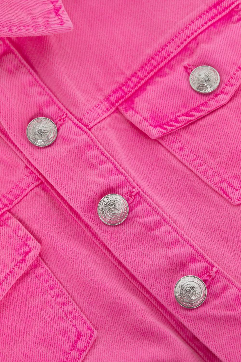 Classic, cool and works with almost any outfit choice. Introducing the Koda Crop Jacket by L'Agence, a stylish reinterpretation of the classic jean jacket in vibrant Pink Glo. This piece offers a clean, cropped cut with three-quarter sleeves and flap pockets, making it a statement piece for any concert or 90s fashion-inspired look. Crafted from premium, 100% cotton denim with a detailed textured pattern, it boasts a rivet button closure and is proudly made in Los Angeles. With a sleek collar and dimensions of about 18.5" from shoulder to hem, it is easy to care for with machine wash instructions. Model is wearing a size XS (5'10.5" height, 33" bust, 24" waist, 34" hips).