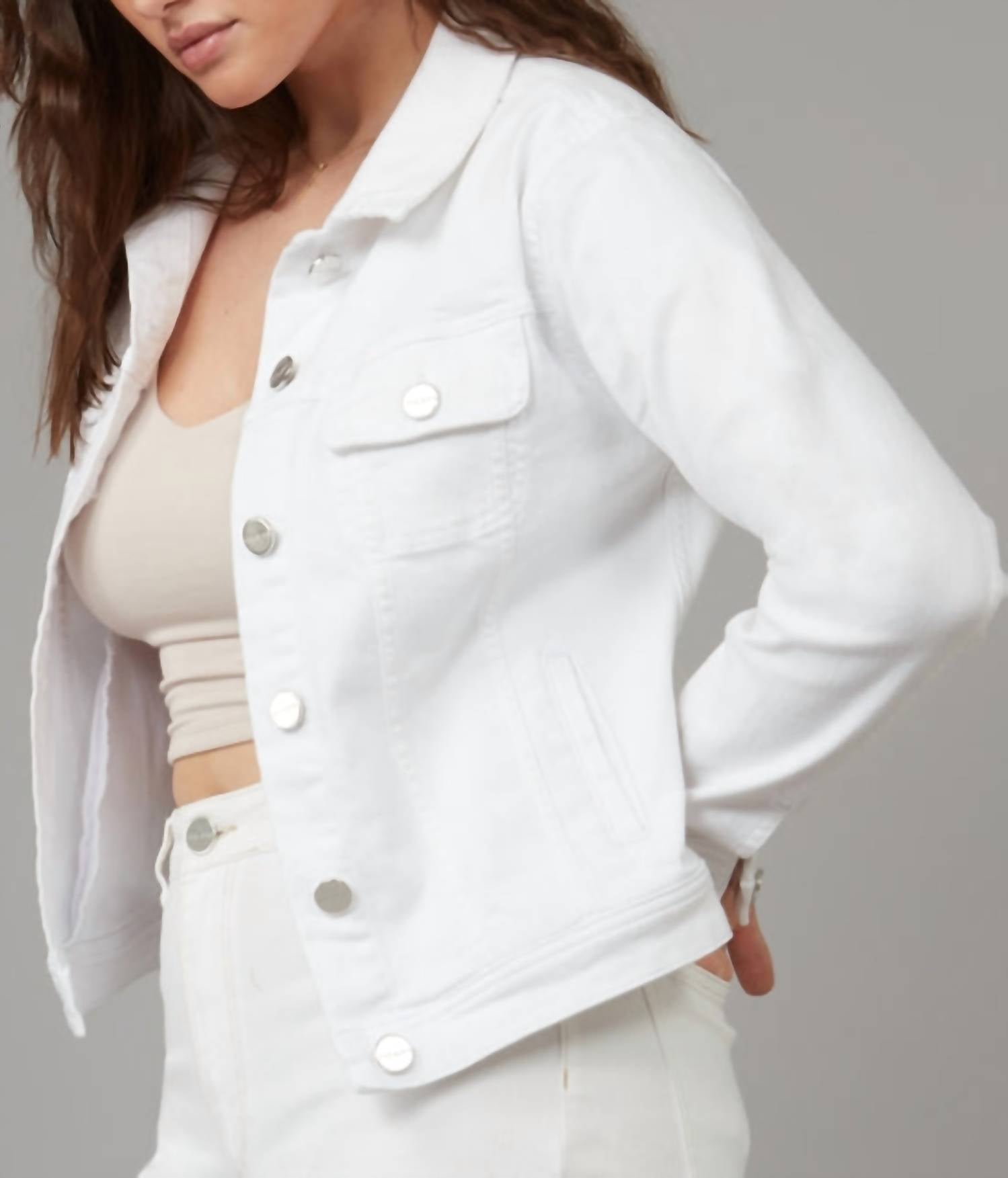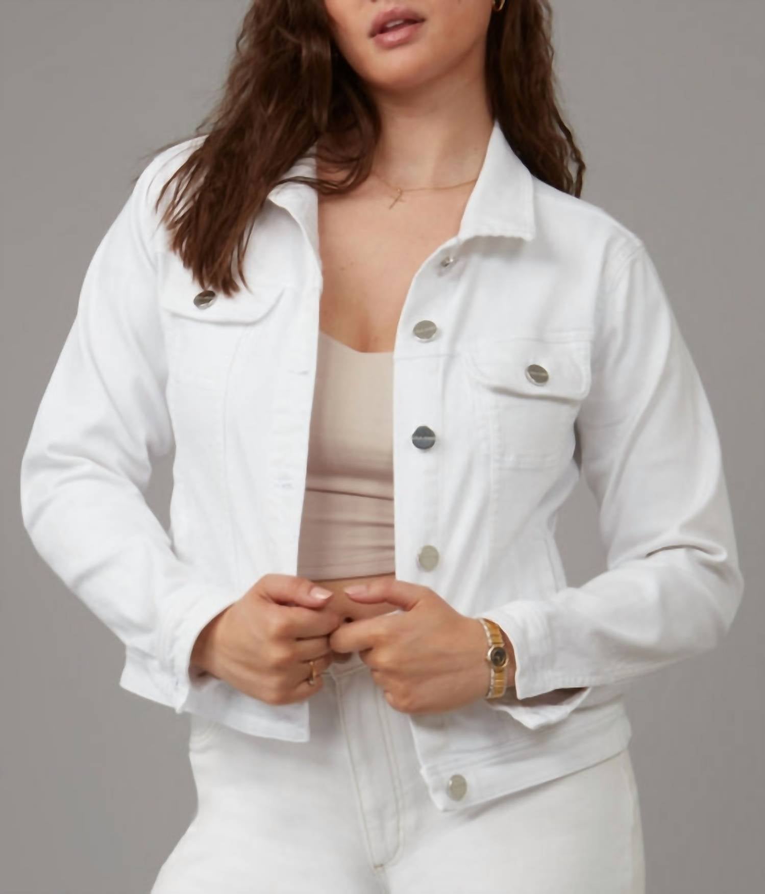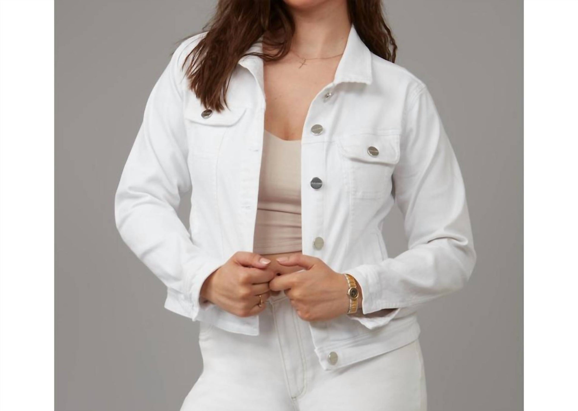 Throw this adorable jacket over just about anything for an effortlessly stylish look. Elevate your holiday party style with the Gabriella Jean Jacket by LOLA JEANS in chic white. This women's jacket offers a minimalistic design with long sleeves and a classic collar, crafted from an eco-conscious cotton blend. It features a practical button closure and handy pockets for added functionality. Wear it to complete your Thanksgiving ensemble with its sustainable yet stylish appeal.