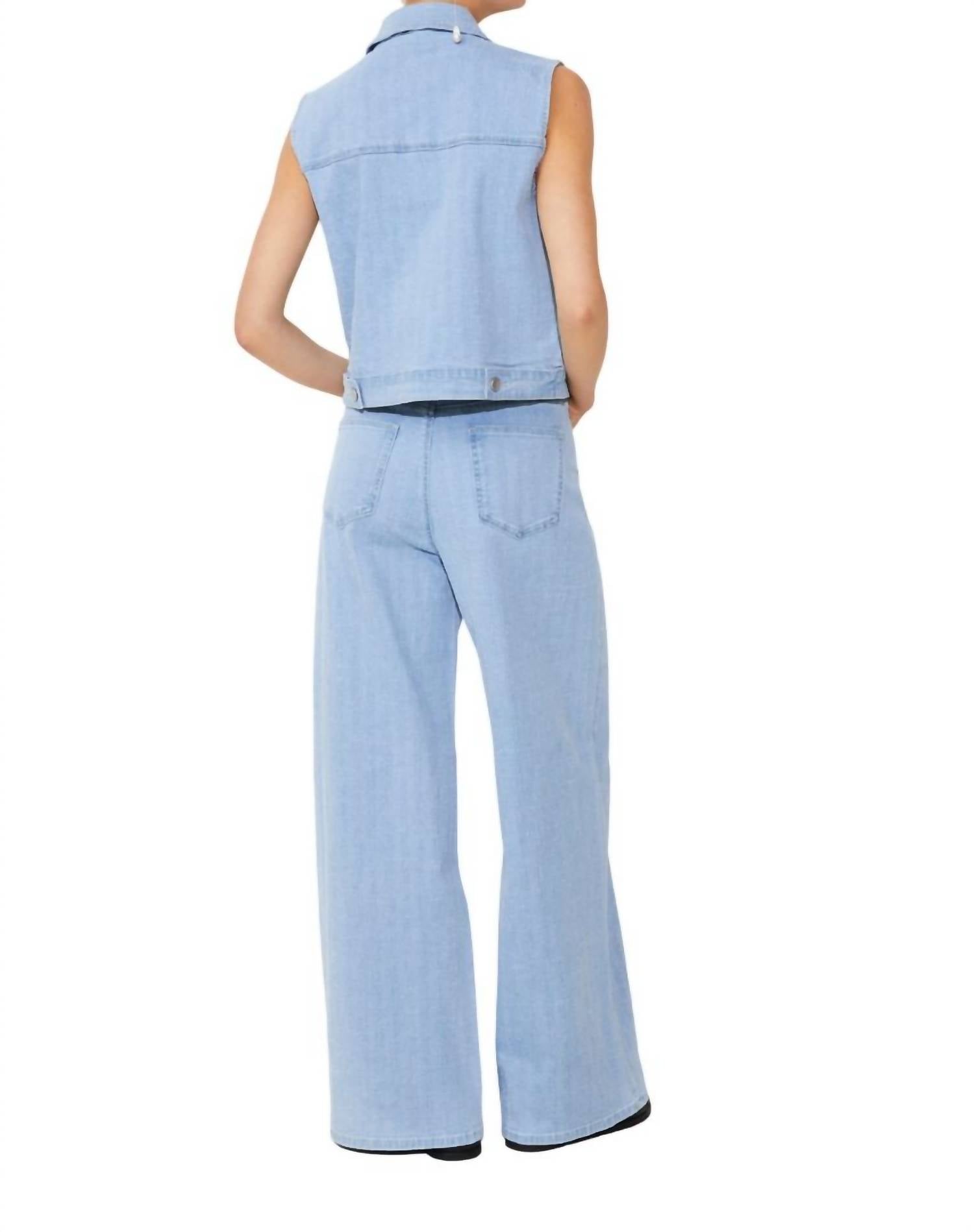 The perfect jean jacket for those slightly crisper days between seasons. Meet the Dylan Sleeveless Denim Jacket by Suncoo, a chic addition to your summer wardrobe in a Jeans Clair hue. Crafted from a 98% Cotton and 2% Elastane blend, this textured, striped-effect jacket features a button closure and two large flap patch pockets for practicality and style. Its collar neckline adds a touch of sophistication to the design. Machine wash.