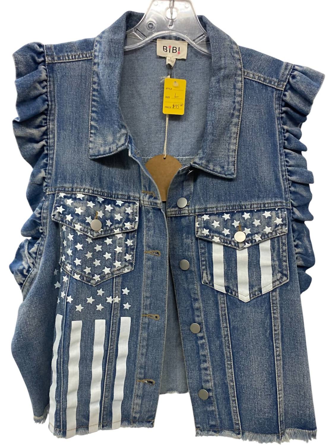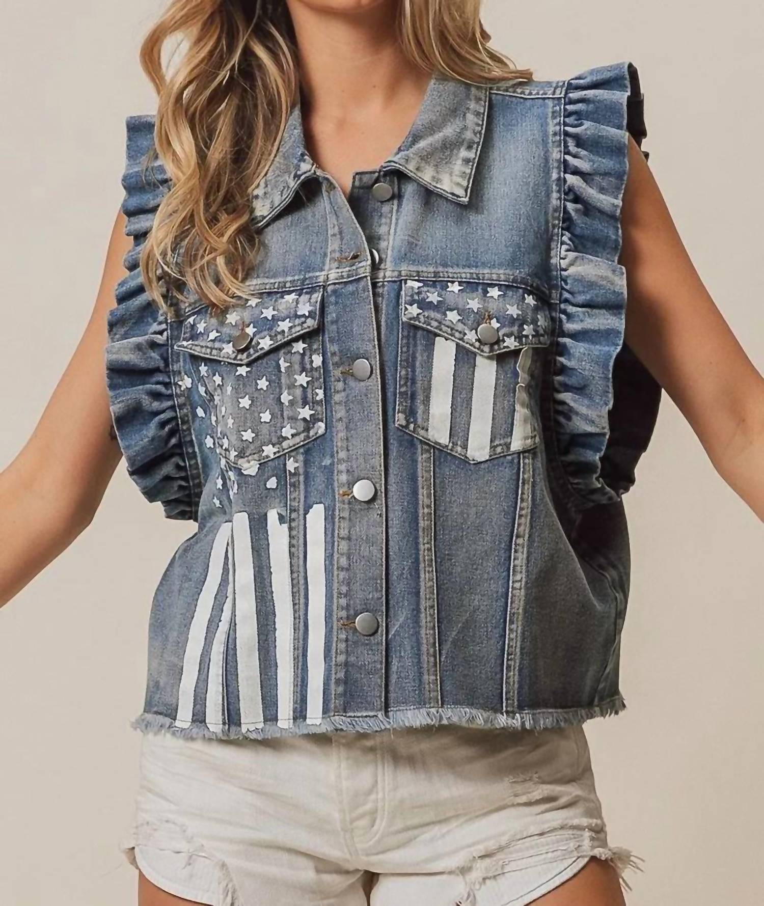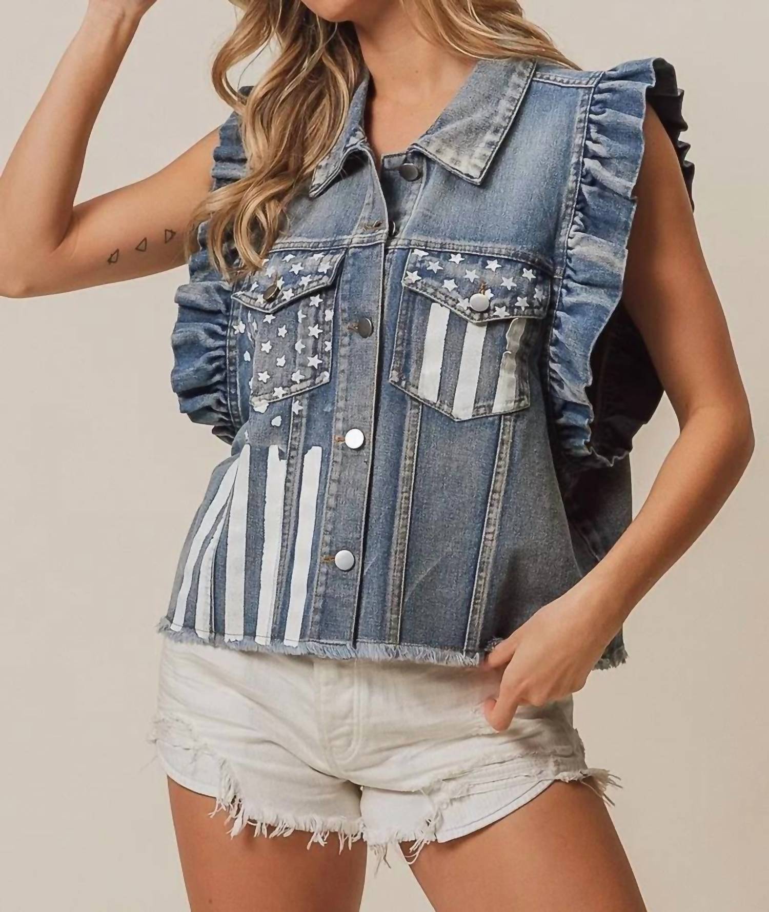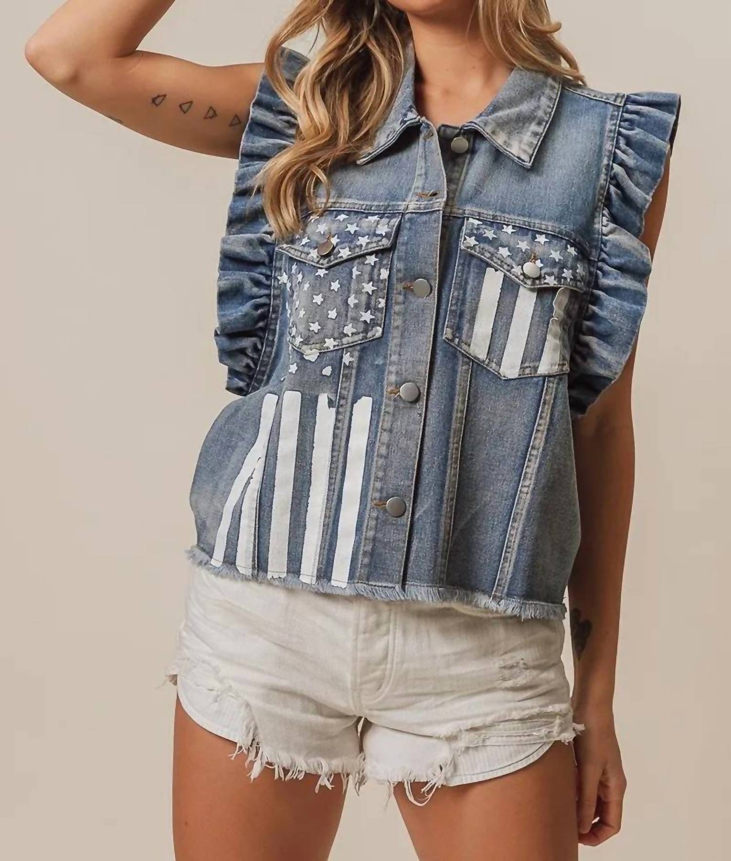 Throw this adorable jacket over just about anything for an effortlessly stylish look. Embrace vintage-inspired style, showcasing a bold patriotic motif in washed denim. Sleeveless jean jacket is slightly stretchy, featuring a basic style with a button closure and added functionality with pockets. Made from 69% Cotton, 21% Polyester, 9% Lyocell (Tencel), and 1% Spandex, designed for comfort and durability. Care instructions include machine washing cold and tumble drying low, making it perfect for easy maintenance and travel-ready style.