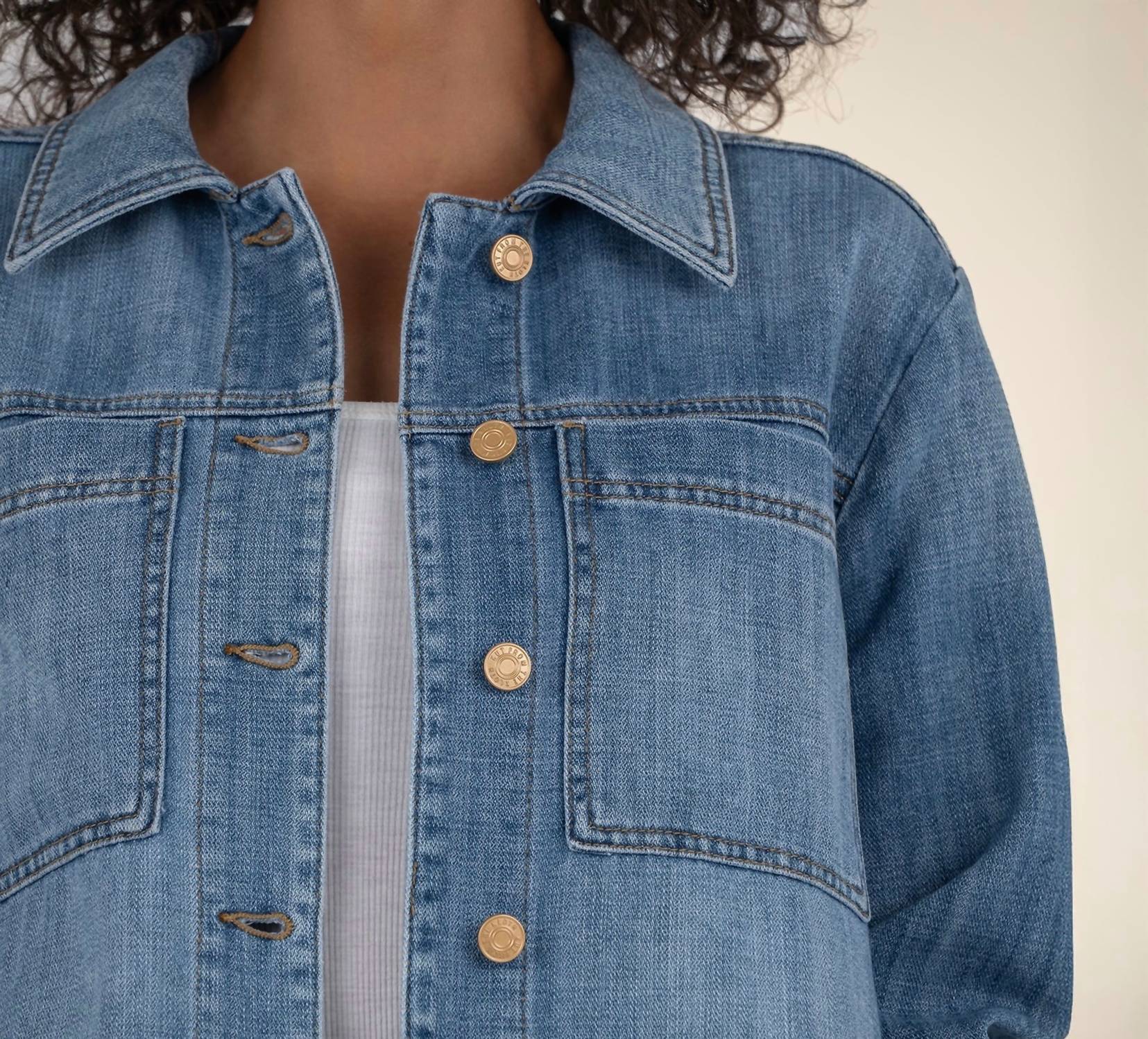 Throw this adorable jacket over just about anything for an effortlessly stylish look. Elevate your concert outfits with the Arya Shirt Jacket from KUT FROM THE KLOTH, a vintage-inspired staple in a medium wash. This women’s denim piece boasts long sleeves and a classic collar, combining style and functionality with front pockets and a button closure. Its composition of 79% Cotton and 21% Spandex ensures comfort and fit, making it an ideal choice for fall occasions. Care for it with ease by simply machine washing.